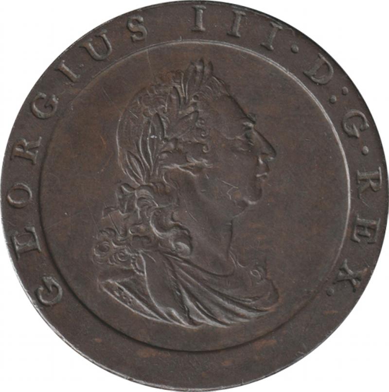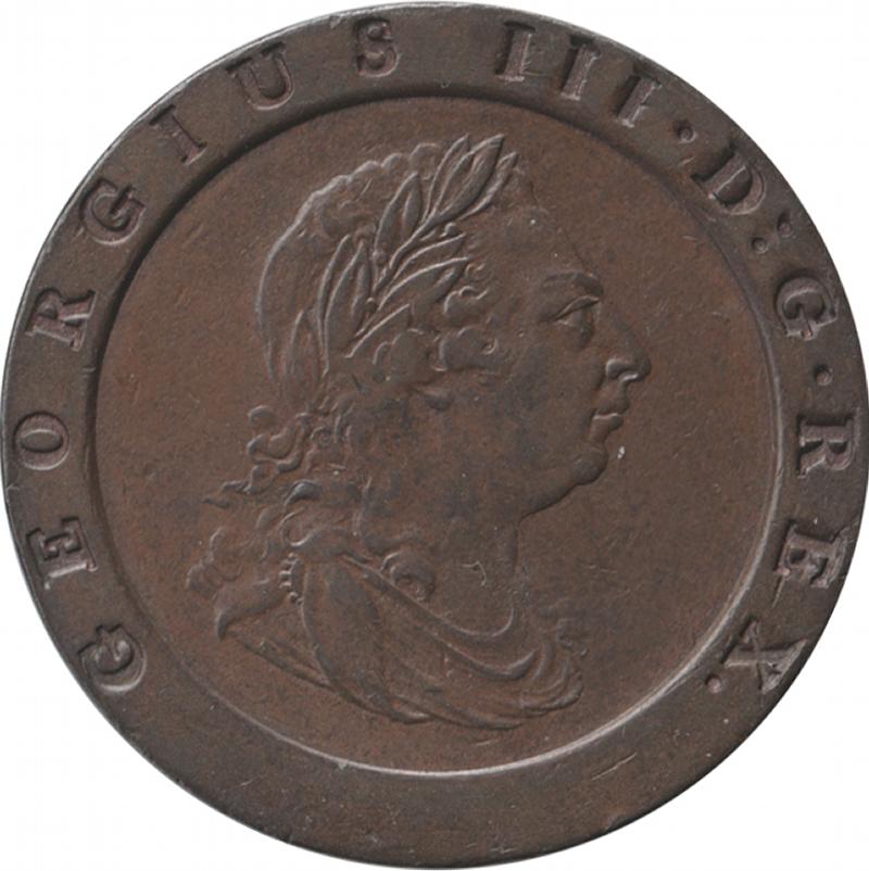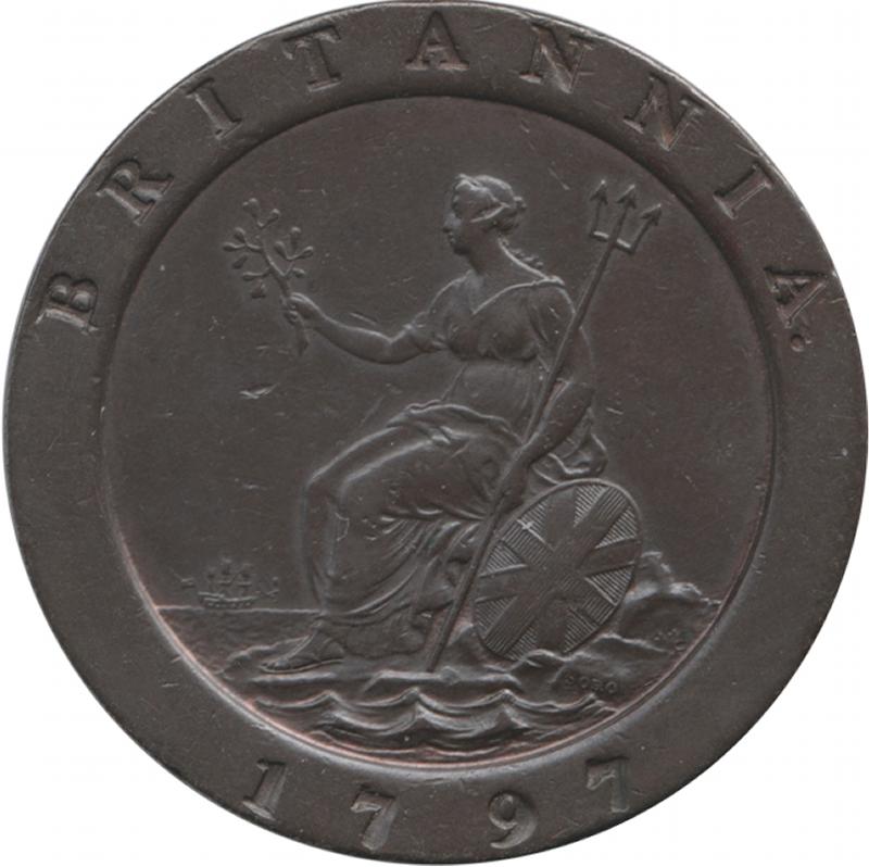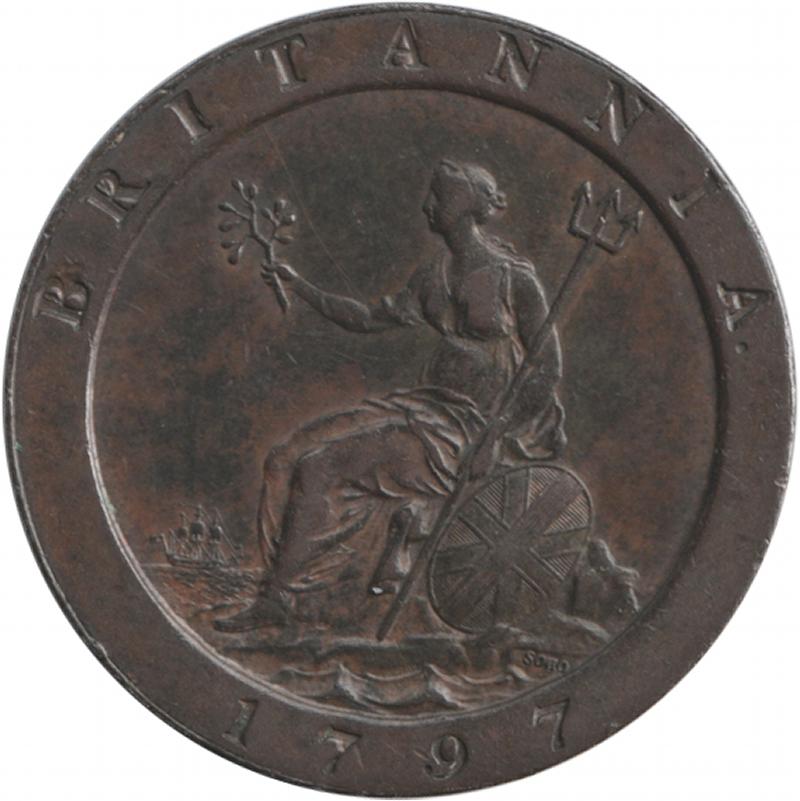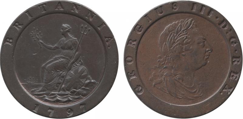 Great Britain Penny (2d) 1797 George III 'Cartwheel Penny' Spink 3777, KM 618, 10 leaves in obv. wreath, gVF. (Image1) (Image2)