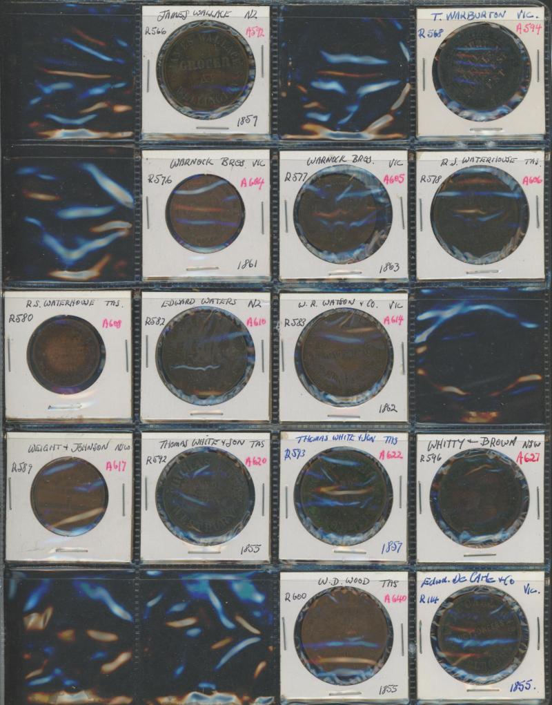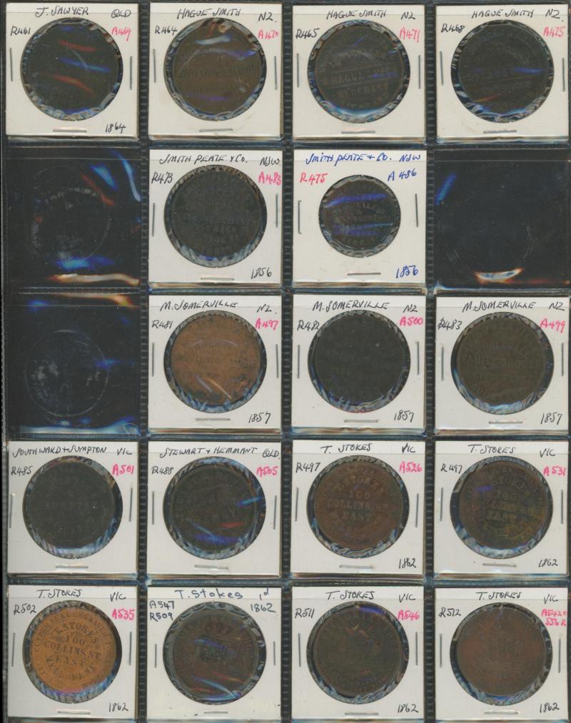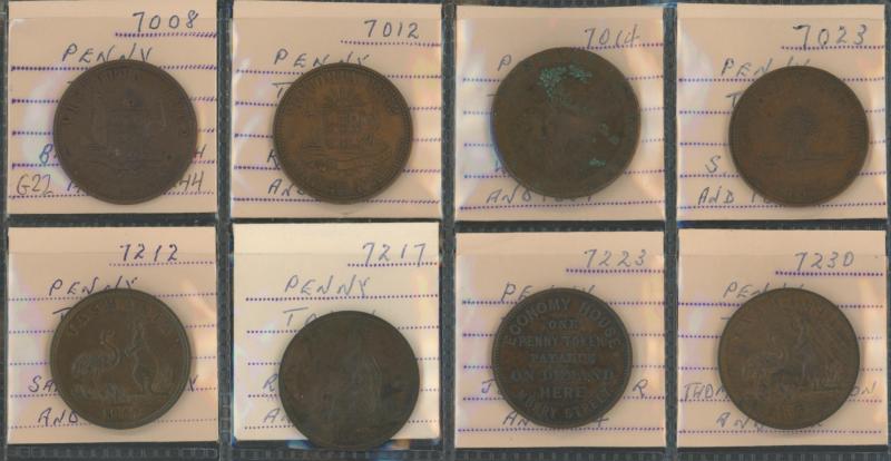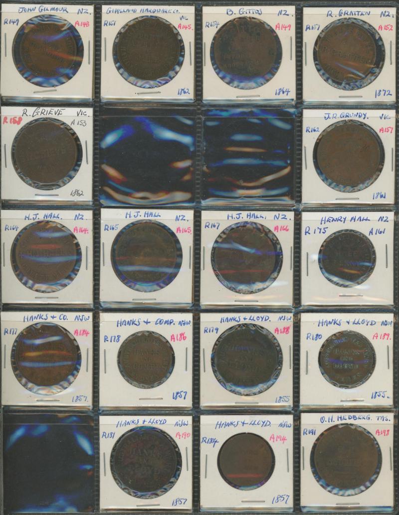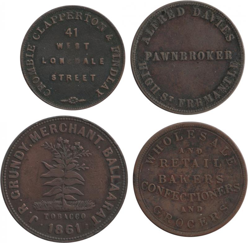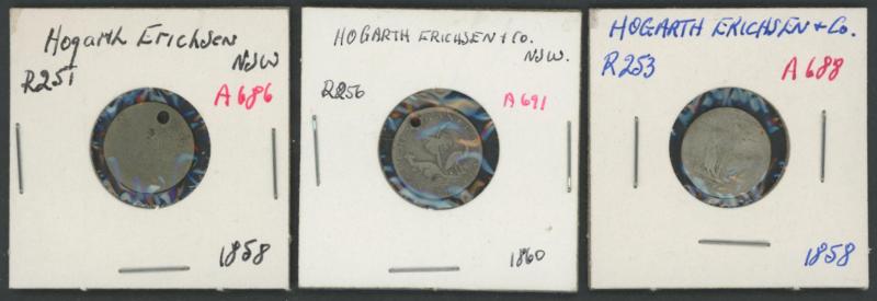 'Alfred Davies' Pawnbroker Freemantle, G57, A94; 1d 'Fenwick Brothers' G70a, A121; 1861 'J.R. Grundy' Ballaarat (2) G88-89, A155 & 157; 3d silver 'Hogarth & Erichsen' Sydney (3) G121 (R8-9), A686 poor holed, G121b, A688 poor, & G123, A691 holed;