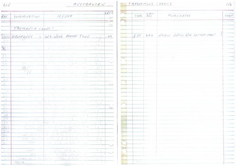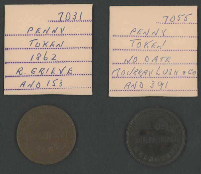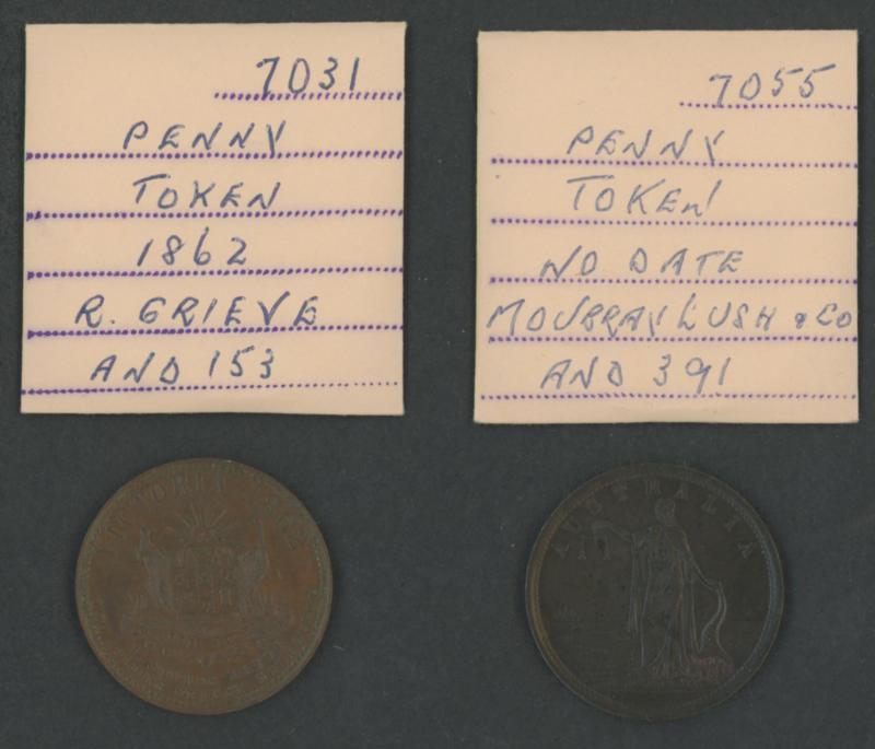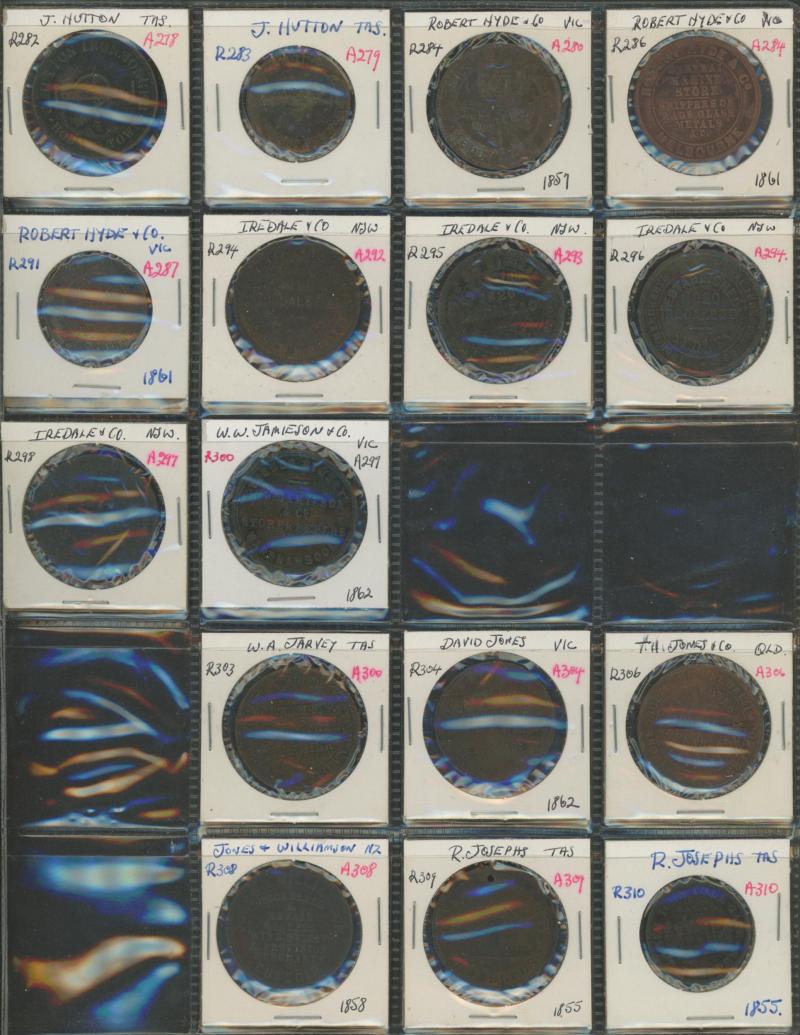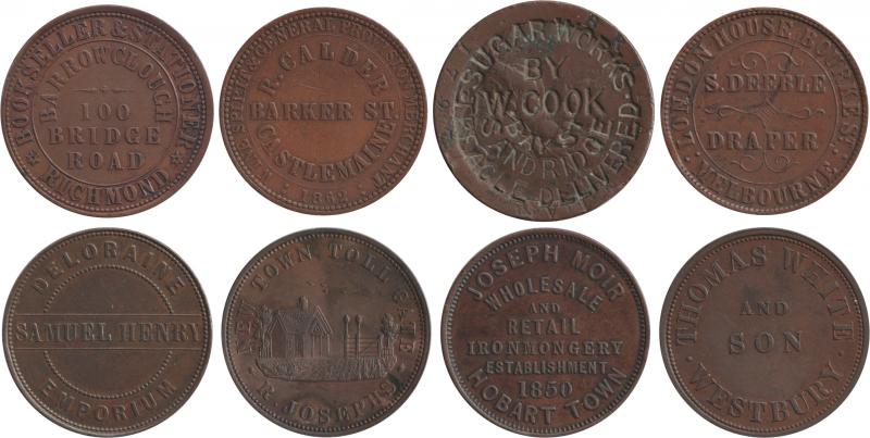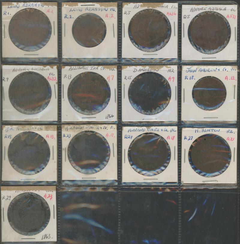 'Alfred Davies' Pawnbroker Freemantle, G57, A94; 1d 'Fenwick Brothers' G70a, A121; 1861 'J.R. Grundy' Ballaarat (2) G88-89, A155 & 157; 3d silver 'Hogarth & Erichsen' Sydney (3) G121 (R8-9), A686 poor holed, G121b, A688 poor, & G123, A691 holed;