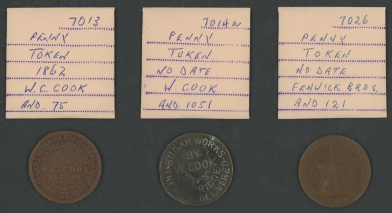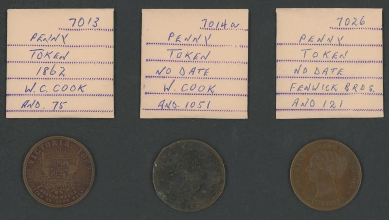 'Moubray Lush' G204, A391; 1862 'George Nichols' G212 (R6-7), A404; 'Union Bakery' Christchurch NZ G288, A588; all identified by Andrews (with a copy of the catalogue 'Australasian Tokens & Coins') and Renniks catalogue numbers, some cleaned,