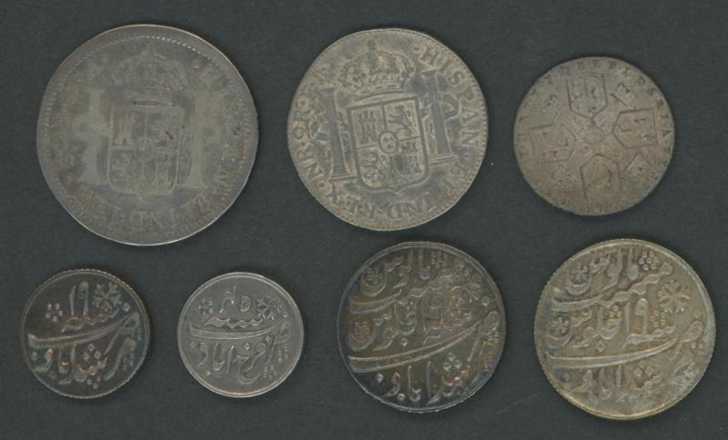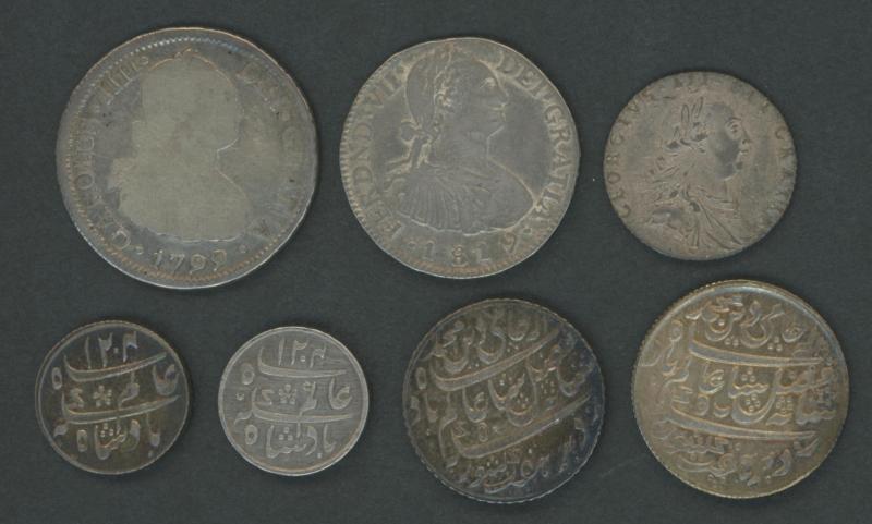KM 70.1 Nuevo Reino (Bogata); Great Britain 6d S3749; 1787 India ¼ rupee 1793-1818 Murshidabad KM 96.1, 1830-33 Farrukhabad KM 75, ½ rupee 1793-1818 Murshidabad KM 97, and 1819-29 Murshidabad KM 105; condition variable.
