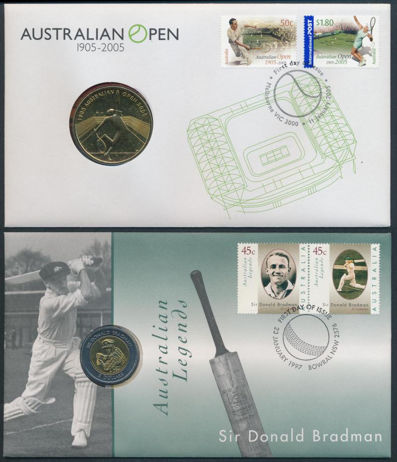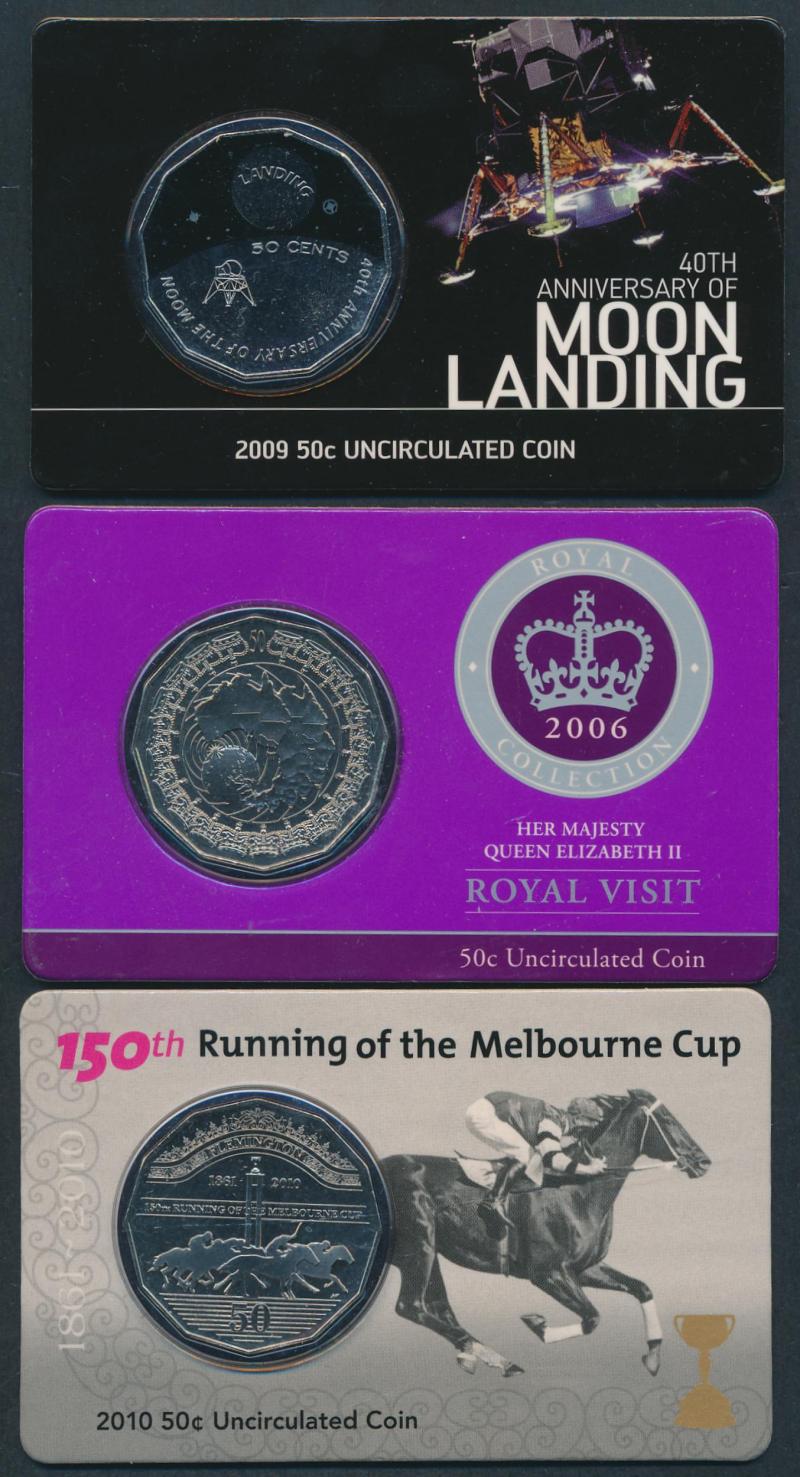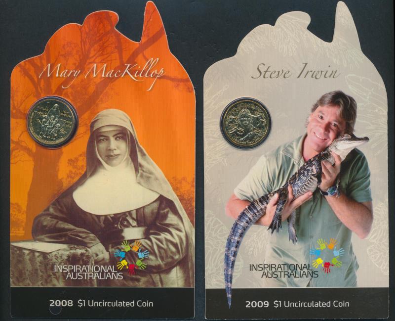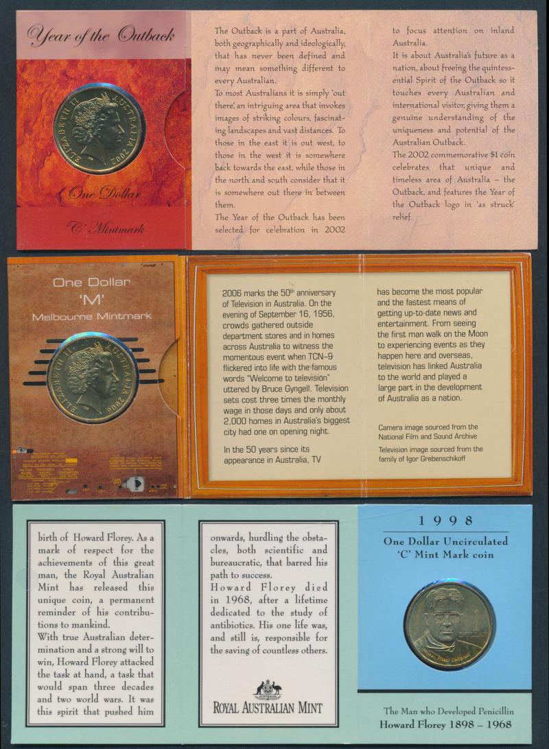 Melbourne Cup x2; $1 cards (66 coins) including 2000 Victoria Cross, 2003 Vietnam x2, 2008 Mary McKillop x2, 2009 Steve Irwin x2, various mintmark packs, 2010 Four-Coin set x2, 1984-92 Five-Coin x2; $5 Al/Br or Bi-metal (22) 1988-2006 including 1998