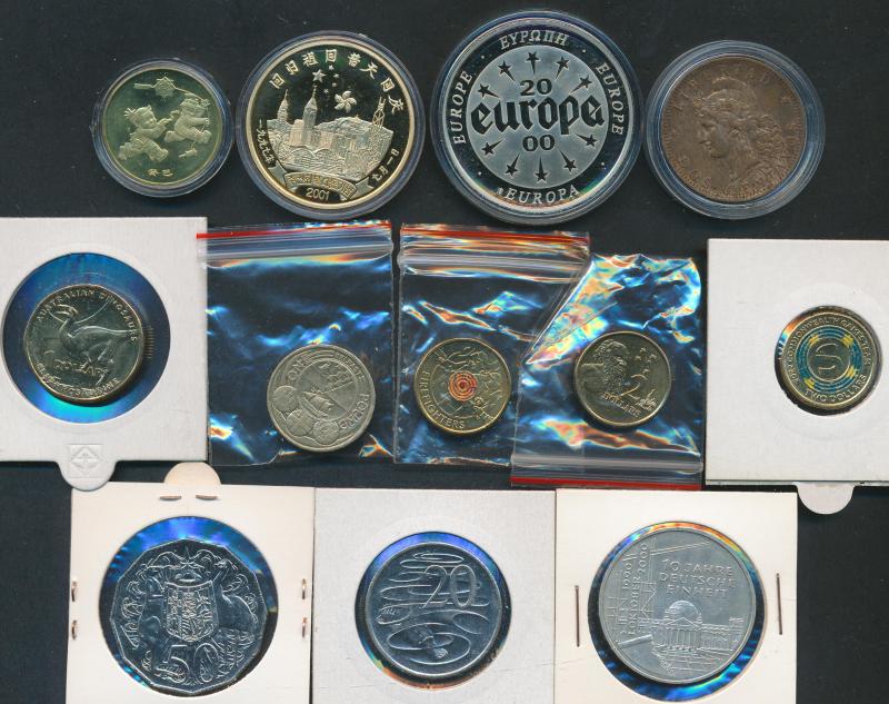 coloured Borobi (x3), $1 2021 Convict Past mm 'C', $1 coloured RSPCA, box of Unc coins in plastic packets; plus some postage stamps; and a few banknotes including Ireland 1983 £20 etc. Weighs 15kg.