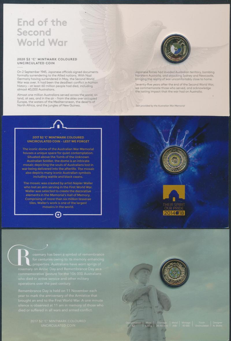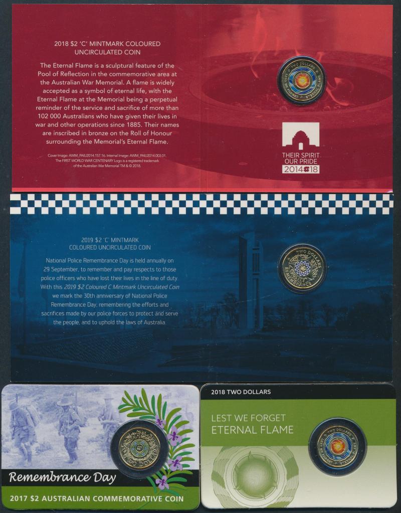 x3, 2021, 2024 Charles III; 20c to $2 (ex $1) single coin packs including coloured $2 2014-2020 Remembrance & Lest We Forget mm 'C' cards; 2015-18 Anzac 20c/25c coin sets; 1988 Bicentennial Coin & Note Collection; PNCs (50+) including 2018 $1