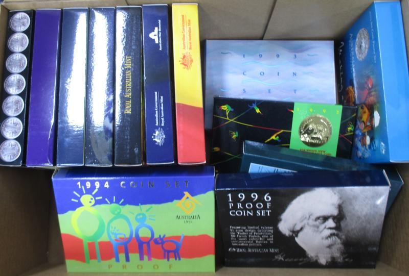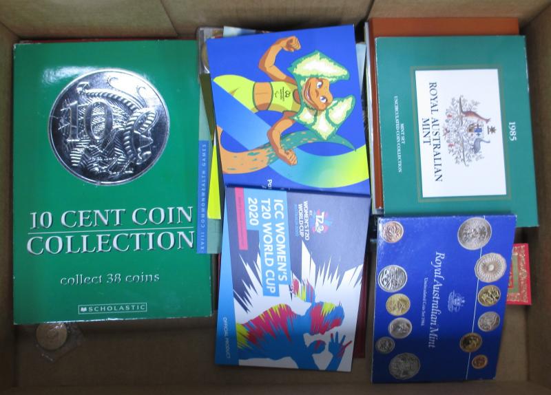 Box containing Six-Coin Uncirculated sets with 1978, 1983-1996; coloured coin collections with 2017 Possum Magic, 2018 Gold Coast