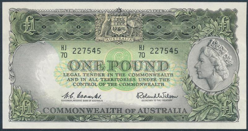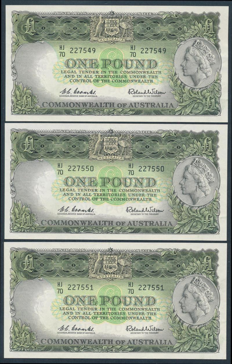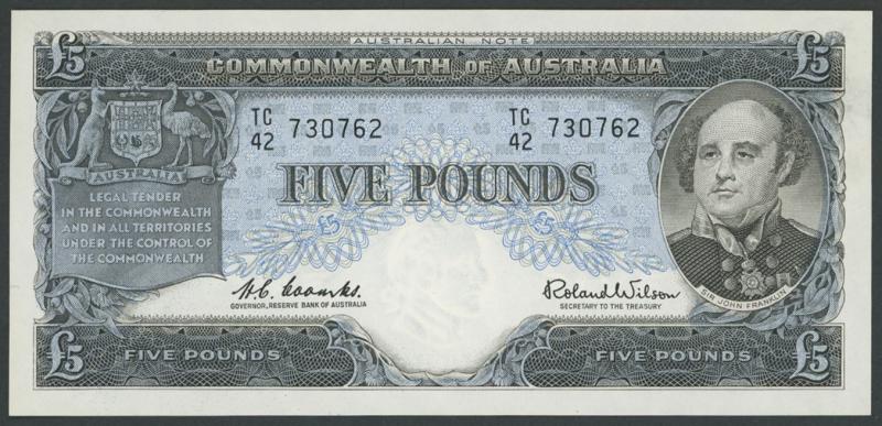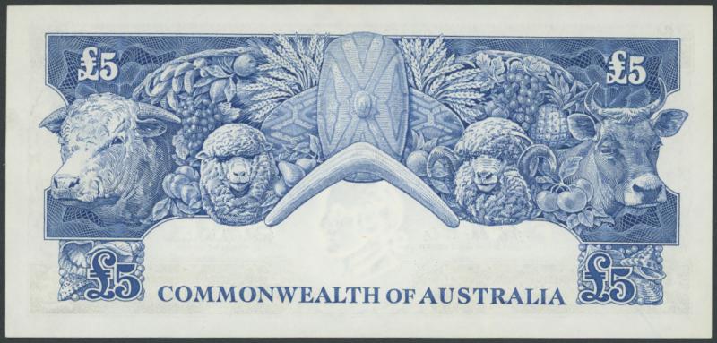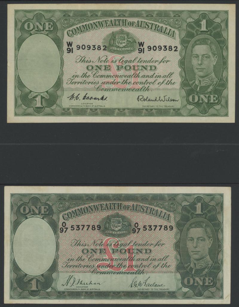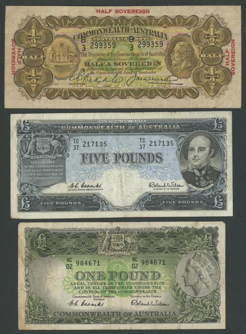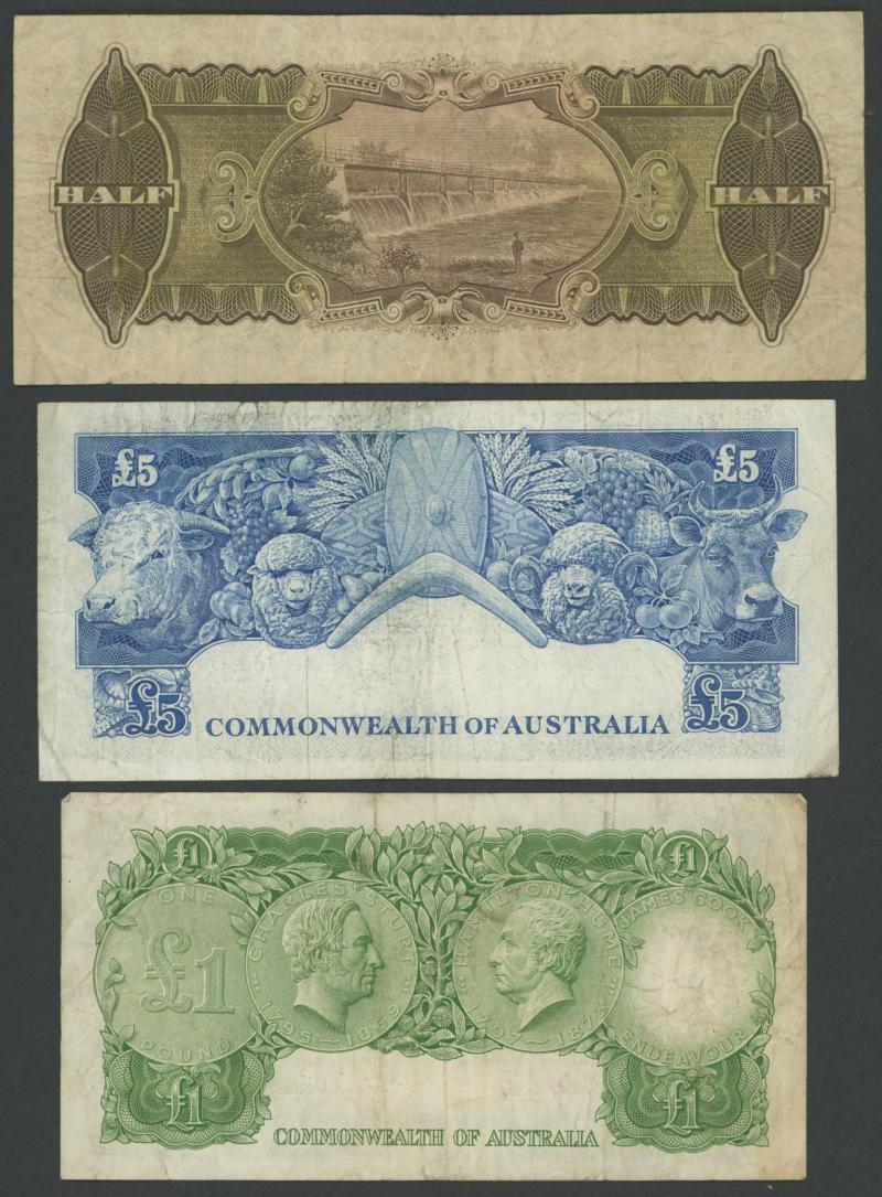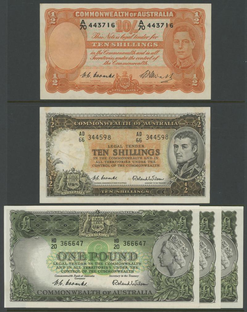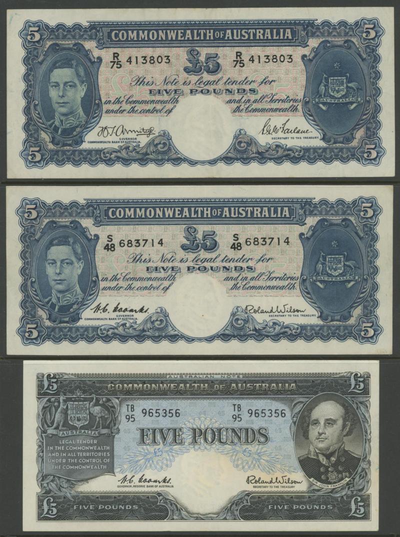 R32, 1953 Coombs/Wilson Commonwealth Bank R33 consecutive run of three (centre-folds); £5 1941 Armitage/McFarlane R45, 1952 Coombs/Wilson R48, and 1960 Coombs/Wilson Reserve Bank R50; condition variable.