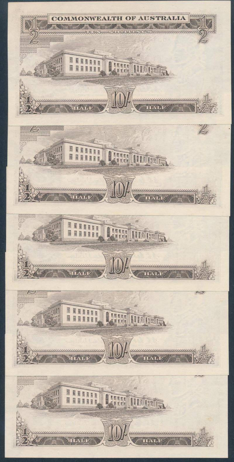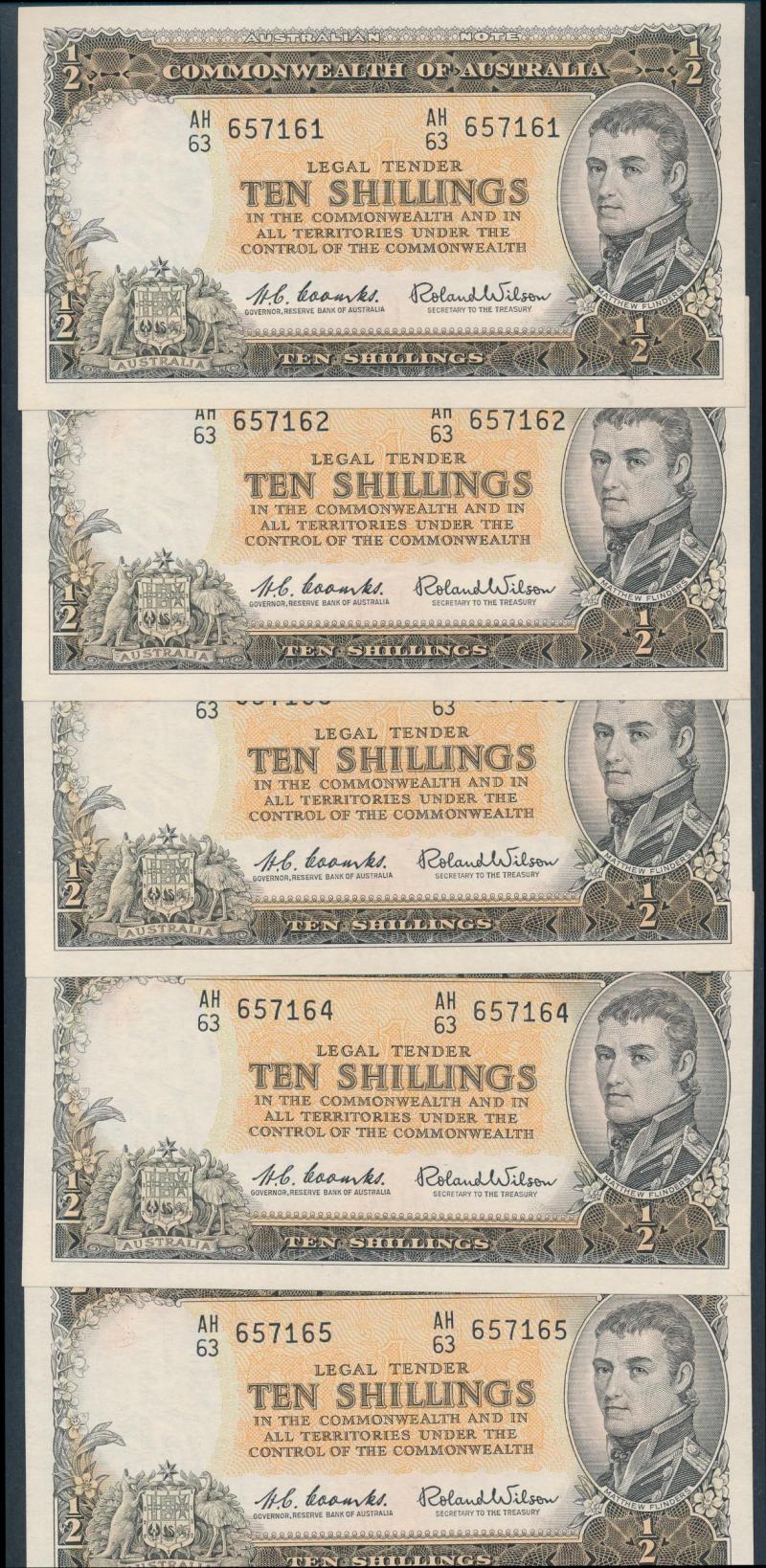 1961 10/- Coombs/Wilson Reserve Bank R17 consecutive run of five serials 'AH/63 657161'-'165' lightest of ageing otherwise
