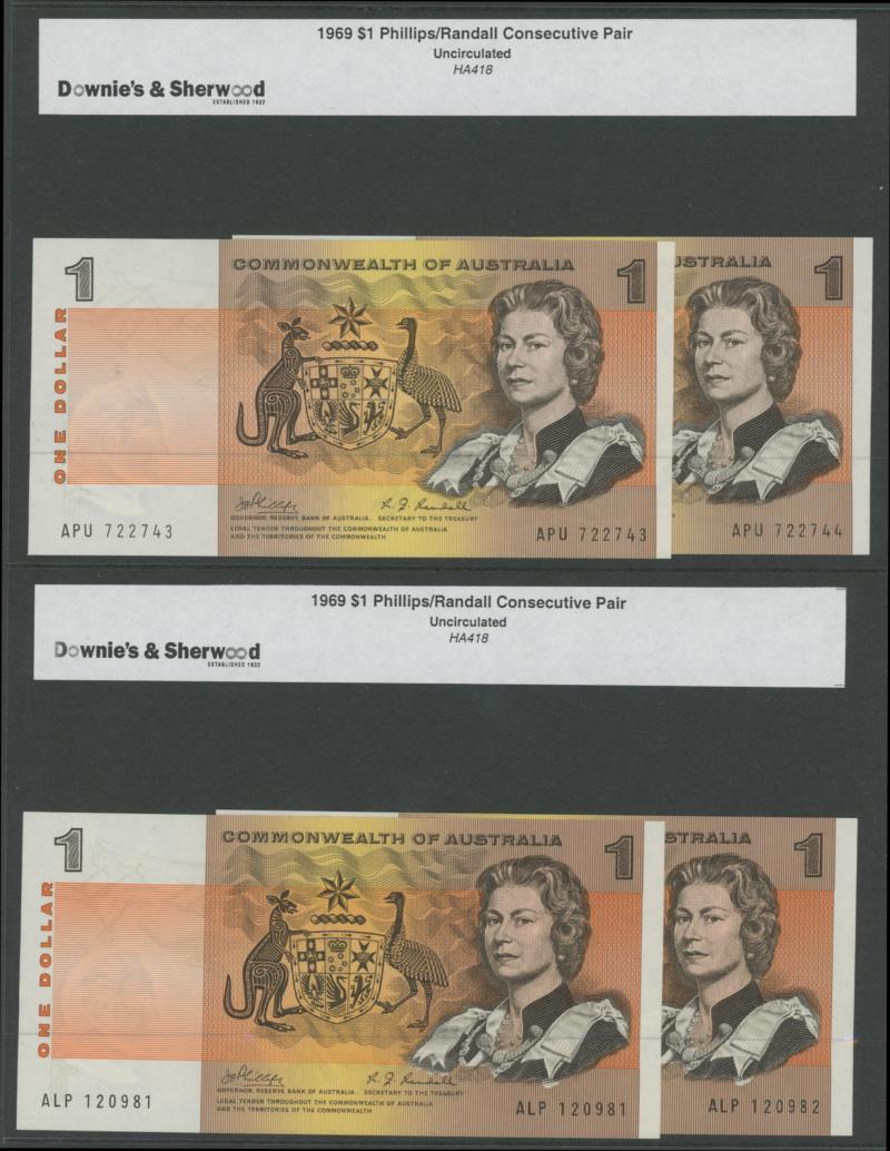 Collection in album with paper $1 1969 Phillips/Randall R73 x2 pairs, 1982 Johnstone/Stone R78 consecutive run of ten; $2 1966