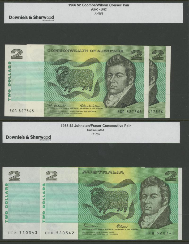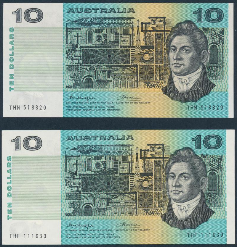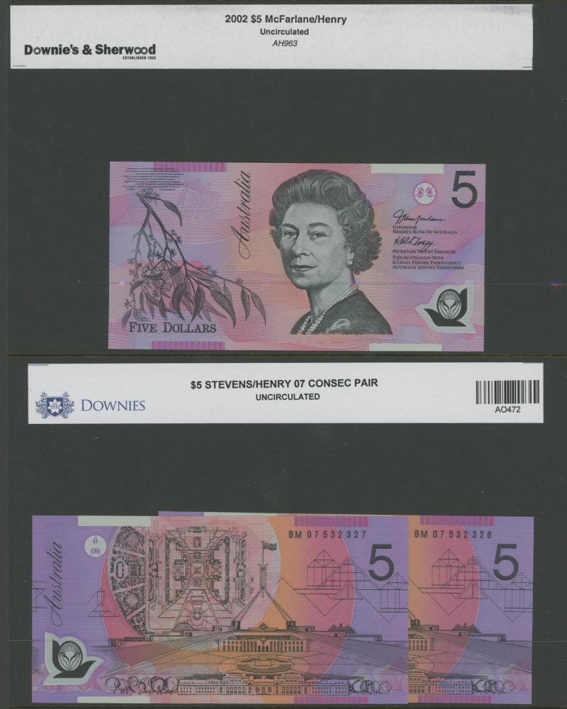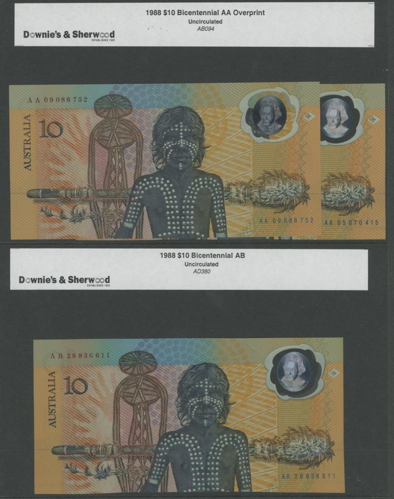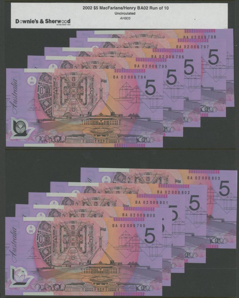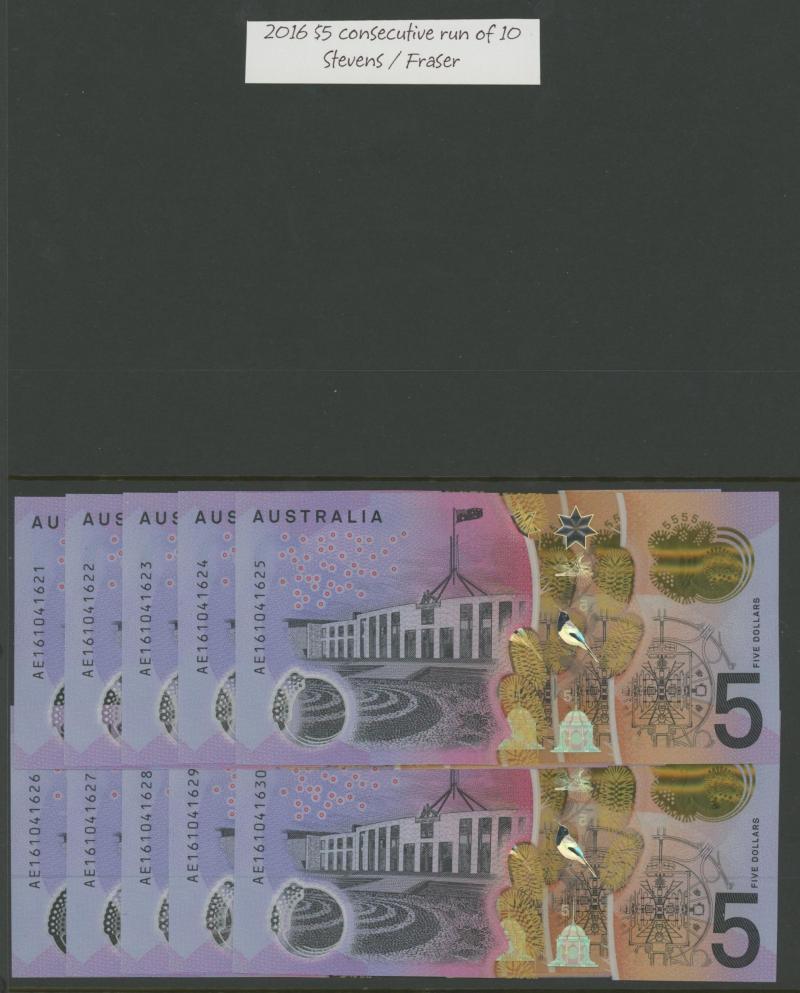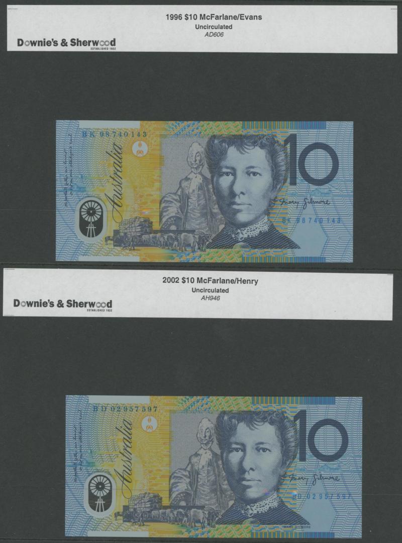 (2), 2002 Macfarlane/Henry R220a First Prefix run of ten, 2007 Stevens/Henry R221a pair, 2016 Stevens/Fraser R224 run of ten; $10 1988 Johnston/Fraser Bicentennial dated notes (2), Reissue R310b, 1993 Fraser/Evans dated note, & normal R316a, 'Blue &