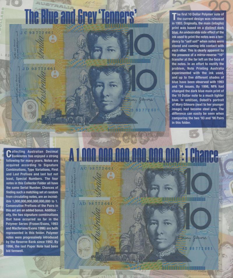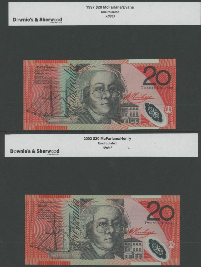 Grey Tenners' folder (4 notes), 1998 Macfarlane/Evans R318c, 2002 Macfarlane/Henry R320a, 2007 Stevens/Henry R321a; $20 1994 Fraser/Evans R416a plus dated note, 1997 Macfarlane/Evans R418a, 2002 Macfarlane/Henry R420a, and 2007 Stevens/Henry R421a,