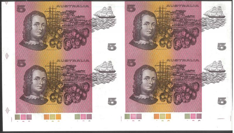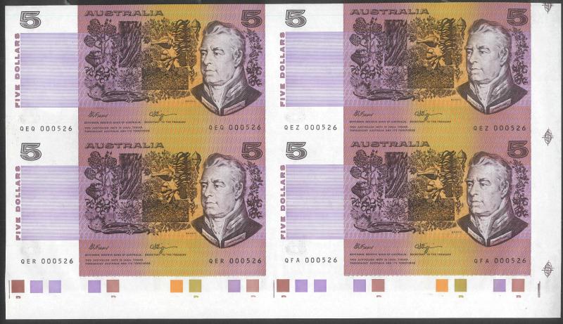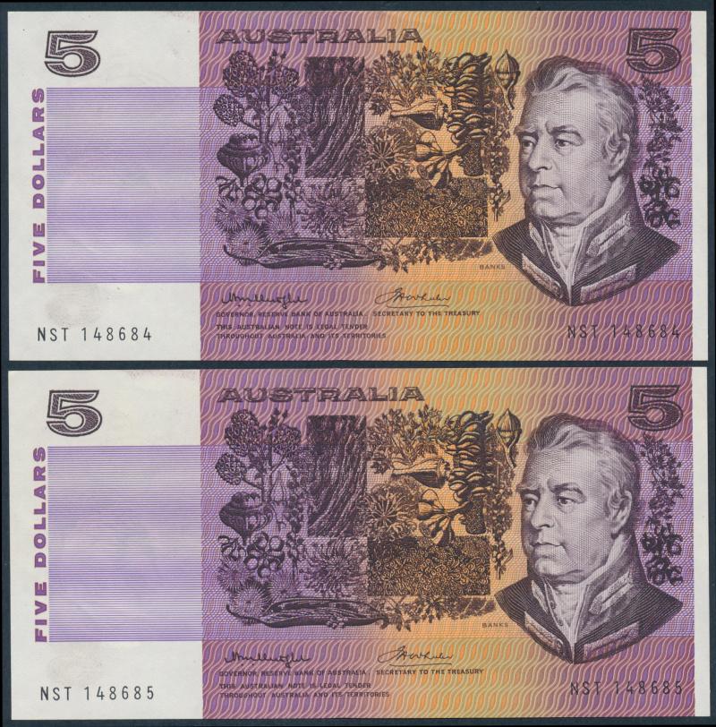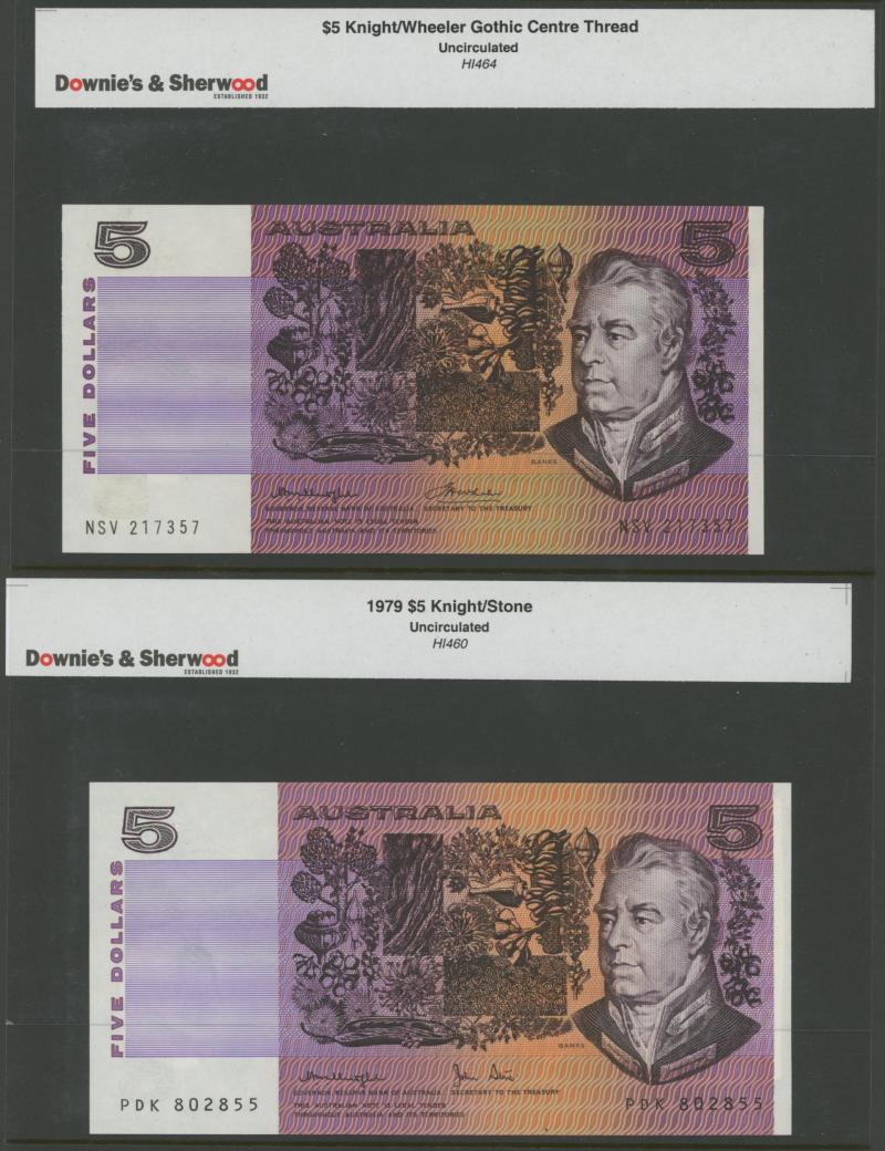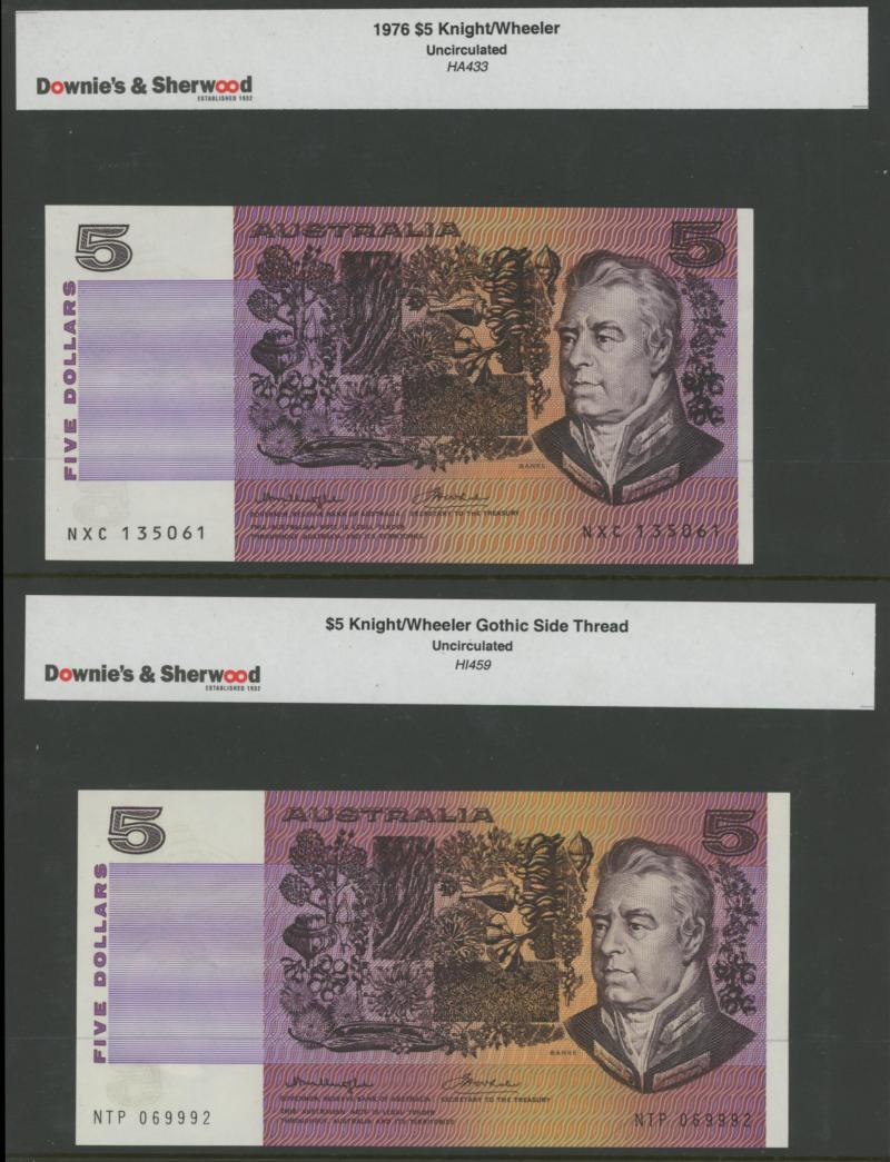 Coombs/Wilson R81, 1985 Johnston/Fraser R89 pair; $5 1976 Knight/Wheeler Gothic Serial Centre Thread R206a, Gothic Side Thread R206b, OCR-B Serial Side Thread R206c, 1979 Knight/Stone R207, 1985 Johnston/Fraser OCR-B R209a, Gothic R209b; polymer $5