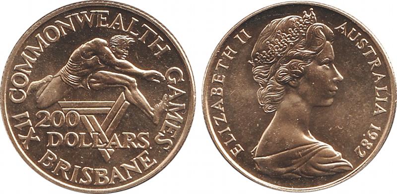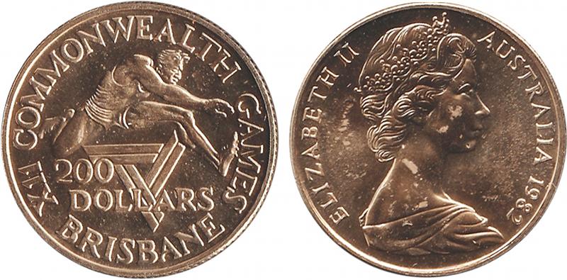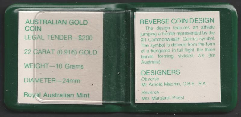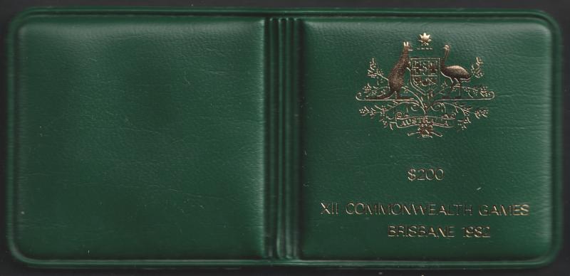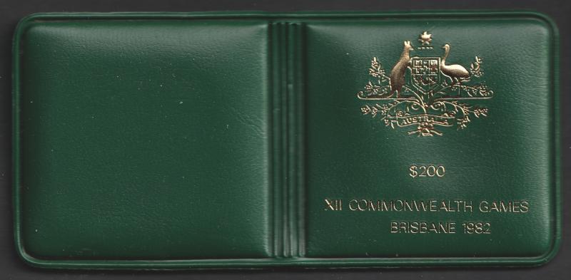 $200 gold (10g 0.916) 1982 Commonwealth Games in green vinyl pouch, Uncirculated. (Image1) (Image2)