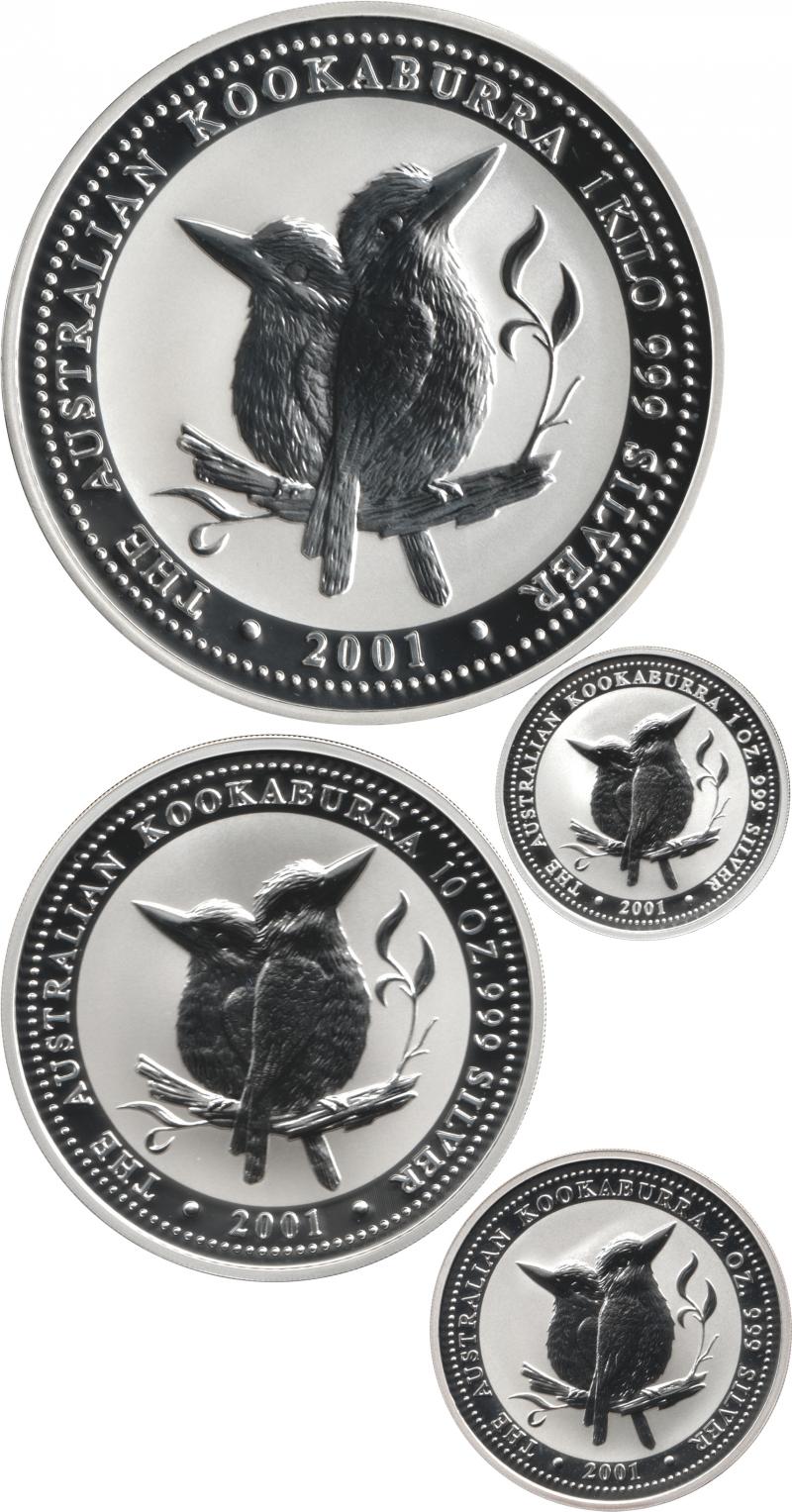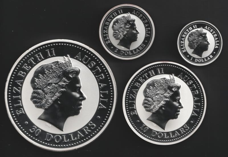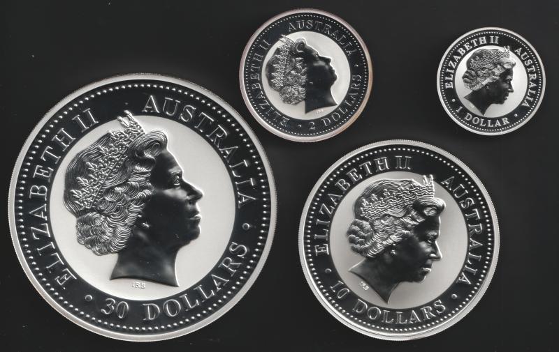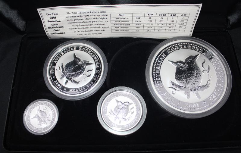 Silver Kookaburra Large Coin Set 2001 comprising (0.999) $30 1 kilo, $10 10oz, $2 2oz, and $1 1oz in capsules and case with vinyl