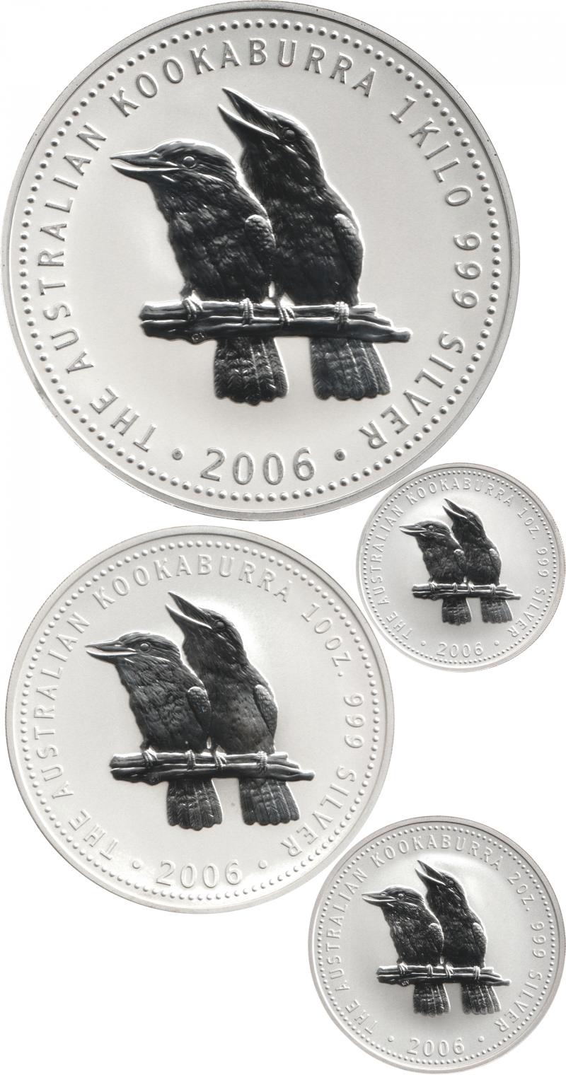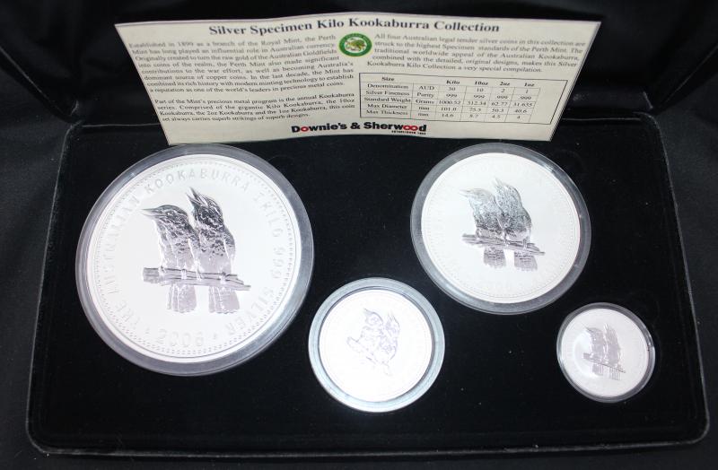 Silver Kookaburra Large Coin Set 2006 Specimen Collection comprising (0.999) $30 1 kilo, $10 10oz, $2 2oz, and $1 1oz in capsules