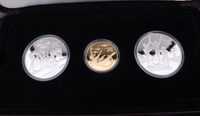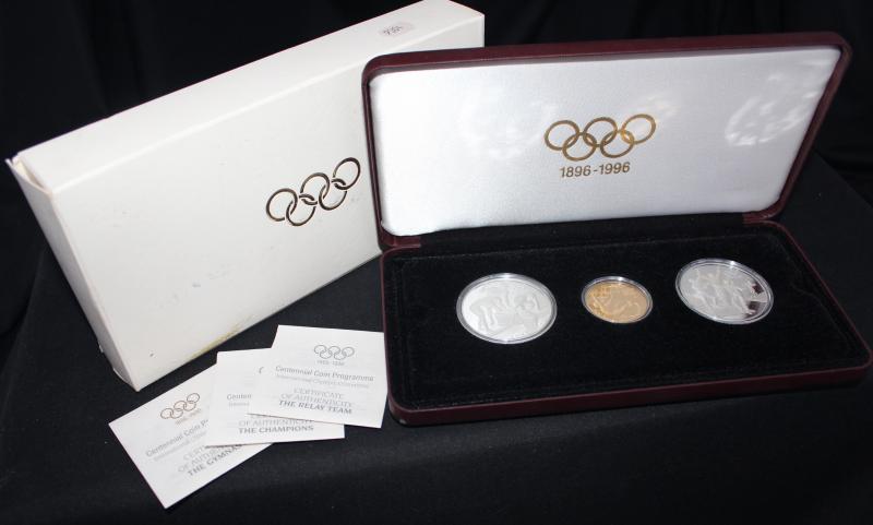 1993 Olympics Centennial Coin Programme set of three Proofs comprising $200 gold (16.97g 0.9167 agw ½oz) The Gymnast, $20 silver