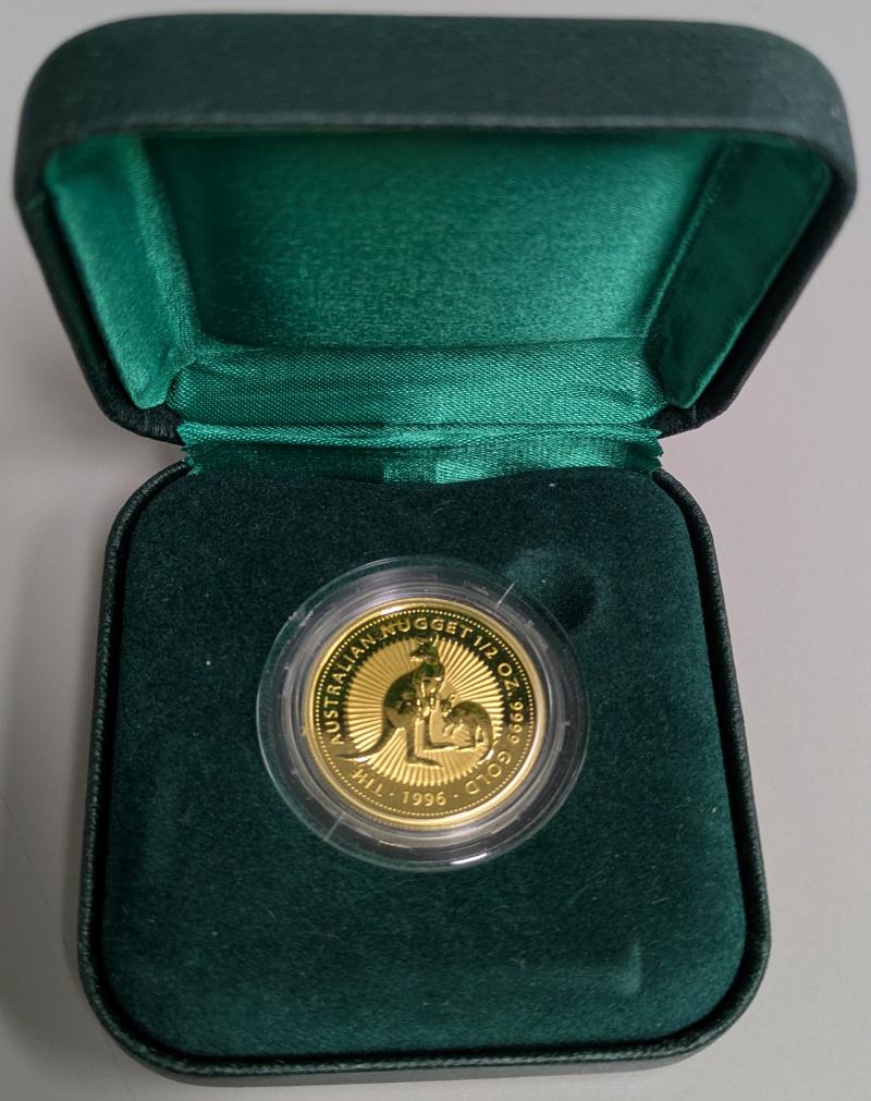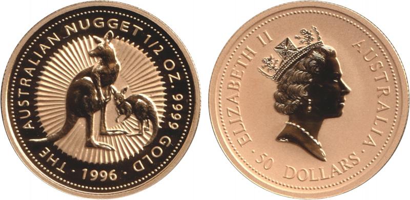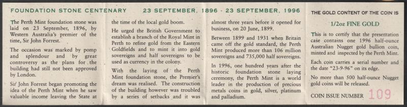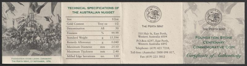 Australian Nugget 1996 $50 ½oz (0.999) gold Foundation Stone commemorative in case with certificate and cardboard outer. (Image1) (Image2)