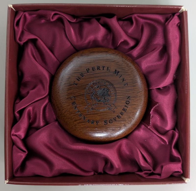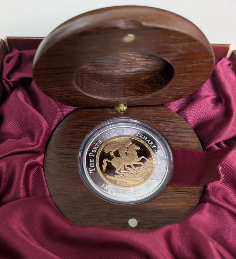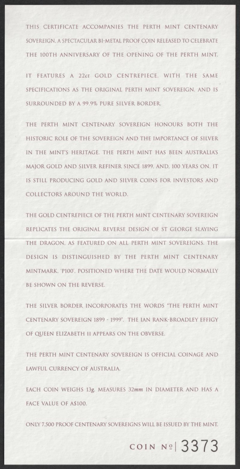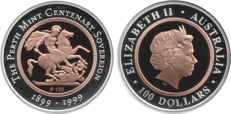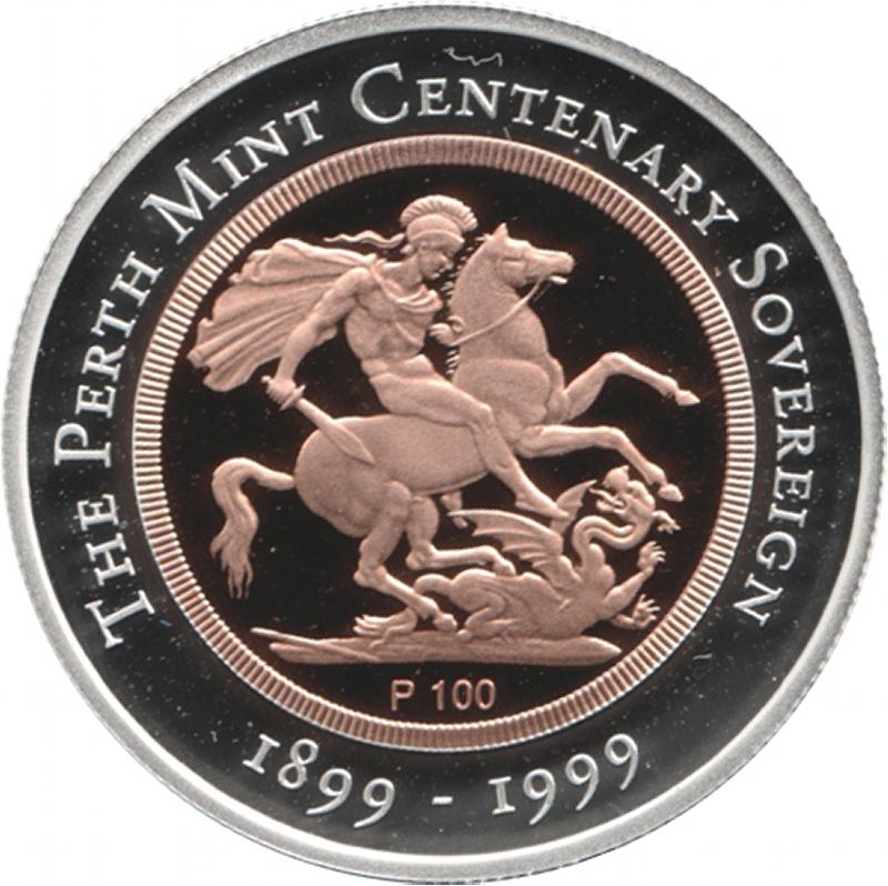 1999 Perth Mint Centenary Sovereign $100 Sovereign Proof (7.99g 0.916) mintmark 'P100' with silver (5g) surround, in wood case with