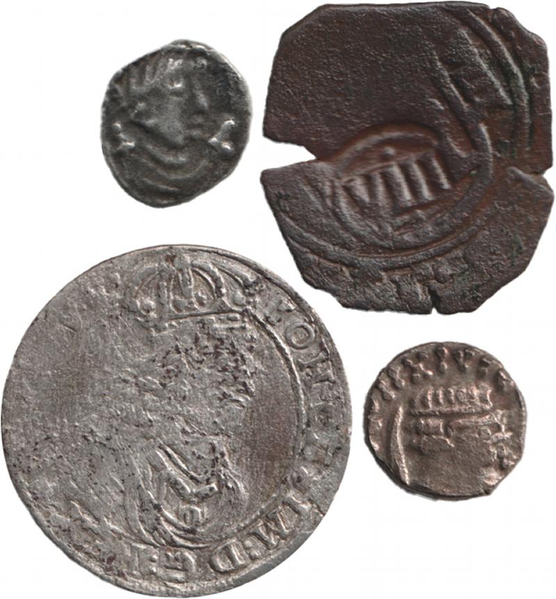 coins found in England including contemporary Roman forgeries circa 350-500 AD (5); Celtic ring money found in Hungary; Macedon 359BC-336BC Philip II (father of Alexander The Great) AE unit; Poland 1660 Casimir (tyrant king) 6 gros; Spanish 1621 ½