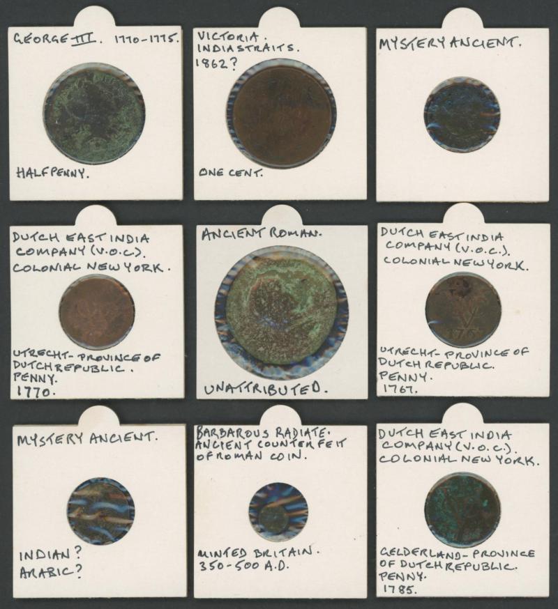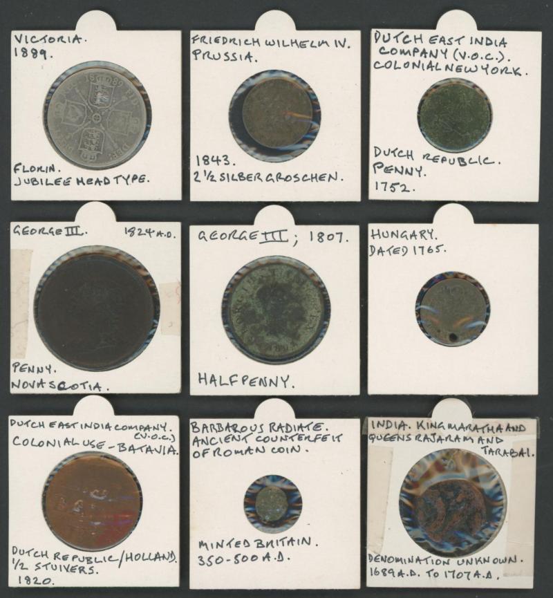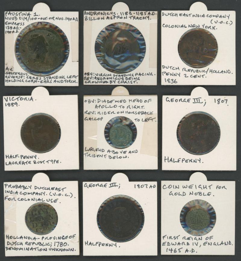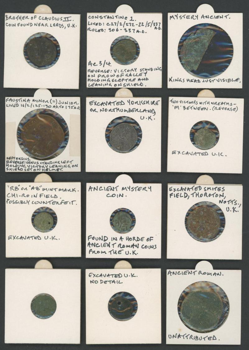 World early excavated coins mostly identified in 2"x2" holders including Anglo-Saxon sceatta 710-760 AD found in England, Roman