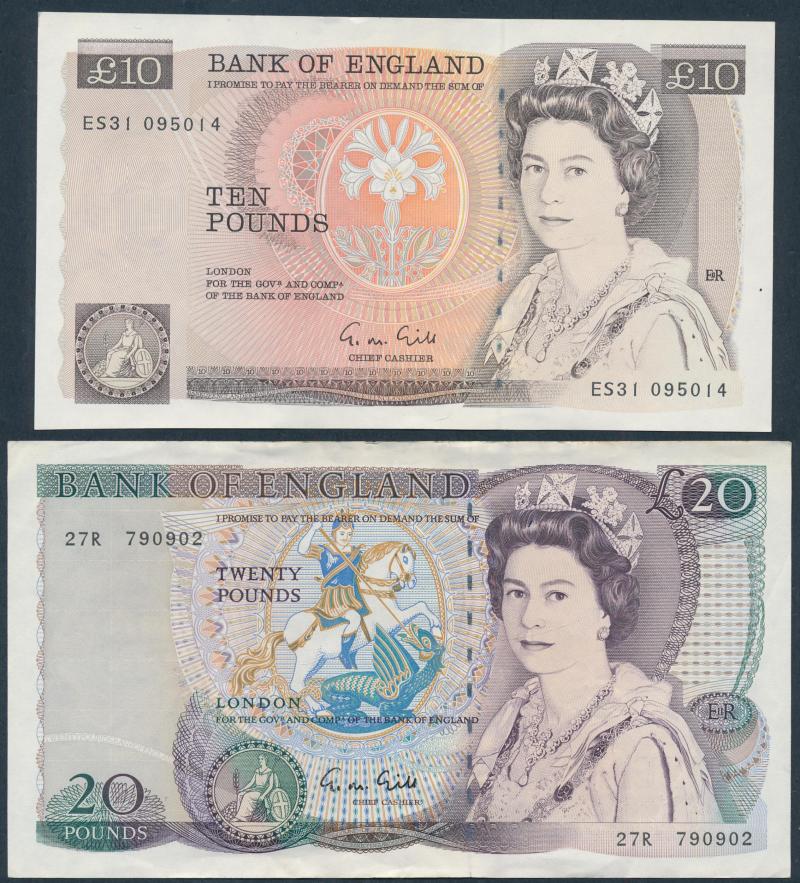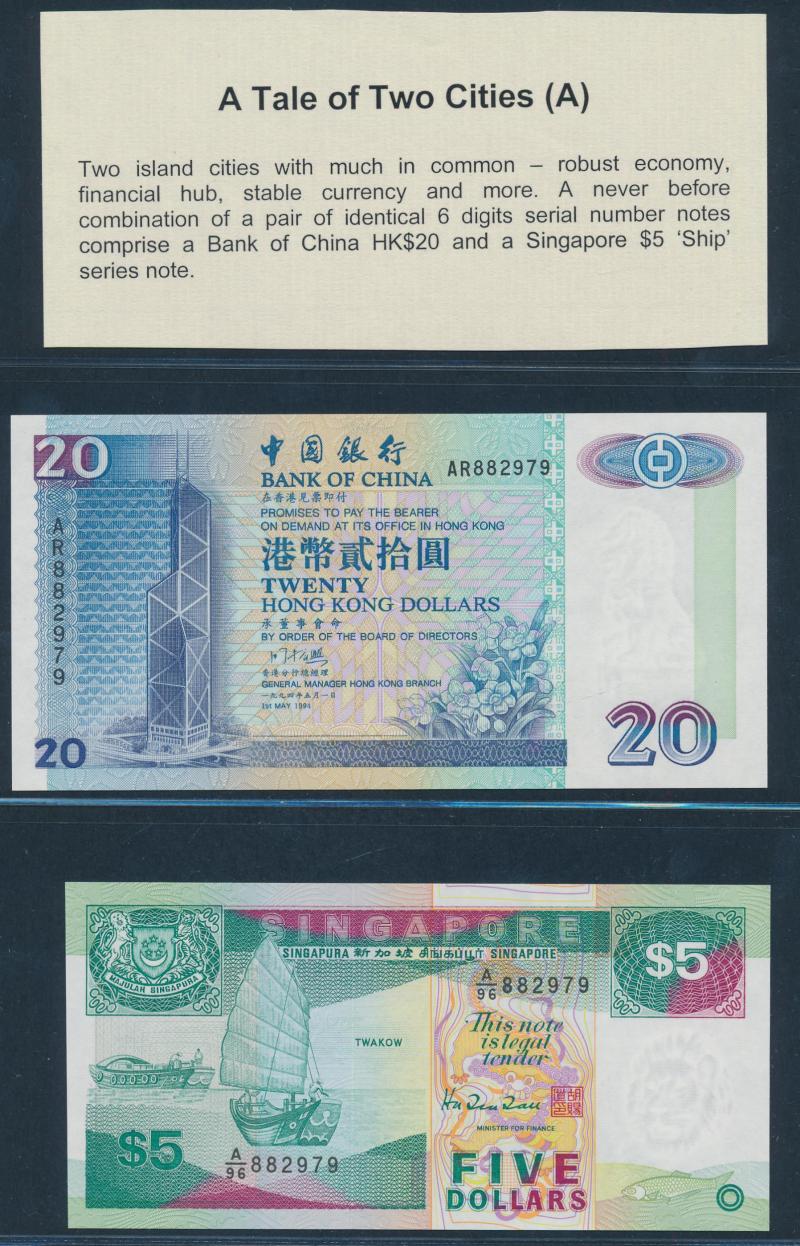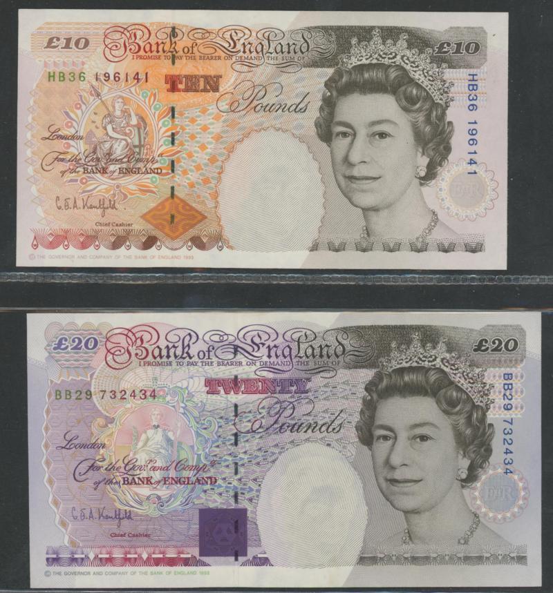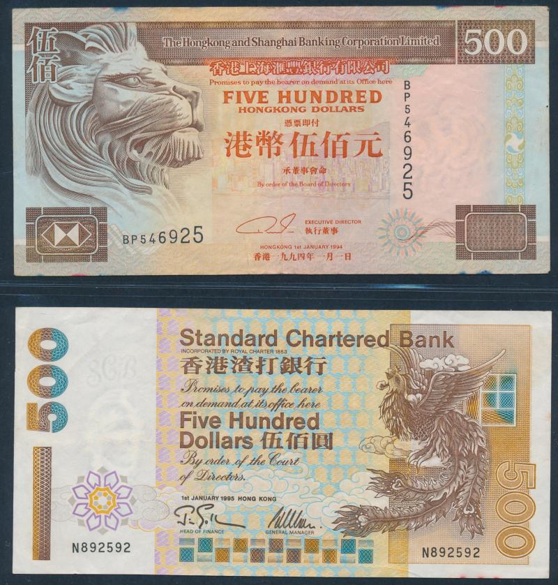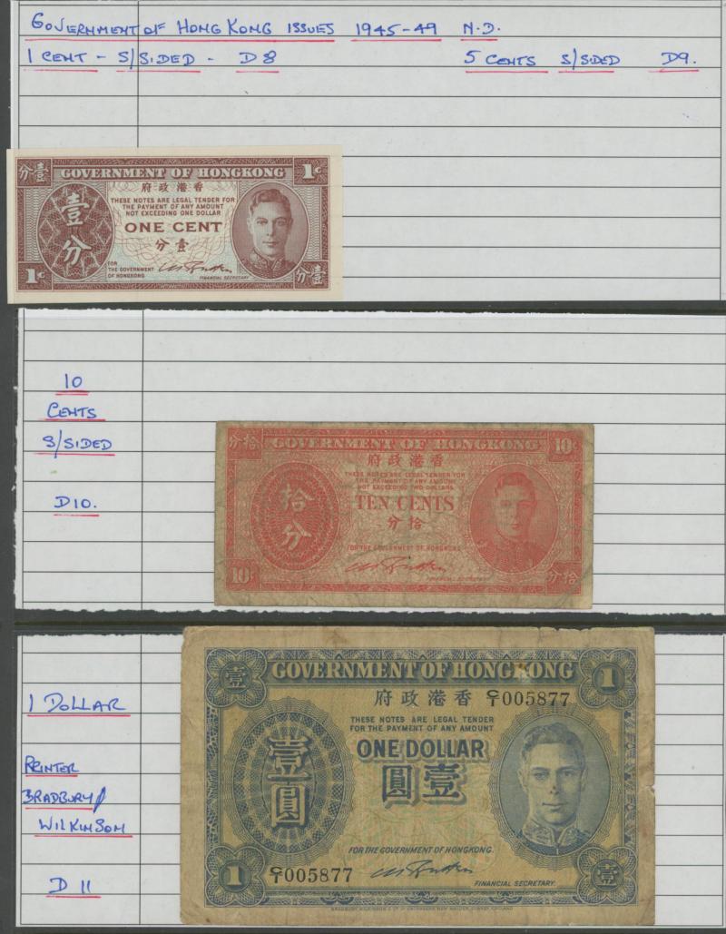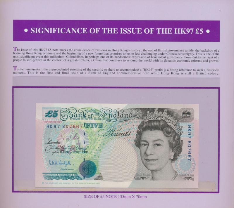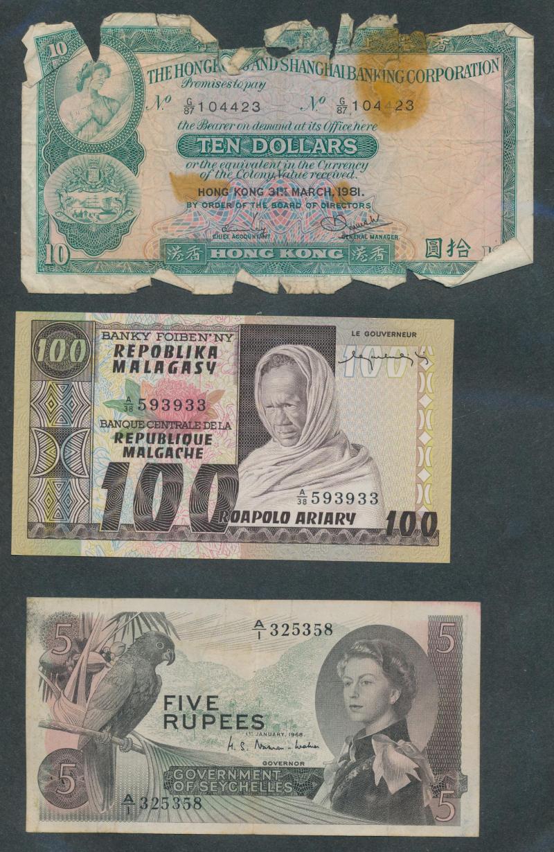 £10 with 1997 £5 Kentfield special prefix 'HK97' (Hong Kong) low number '000243' and '807667'; Hong Kong to $500 1994 HSBC, & 1995 Chartered Bank; Kenya 1973 20 shilling P8d x3, 1975 100s P14b; Malaya 1940s KGVI fractionals to 25c; Seychelles 1968 5