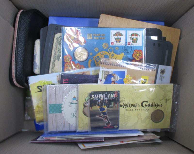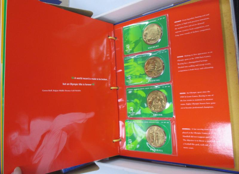 Four cartons containing Australia copper 1ds, Sydney 2000 $5 collection x2 in albums, packaged product including 'Sands of