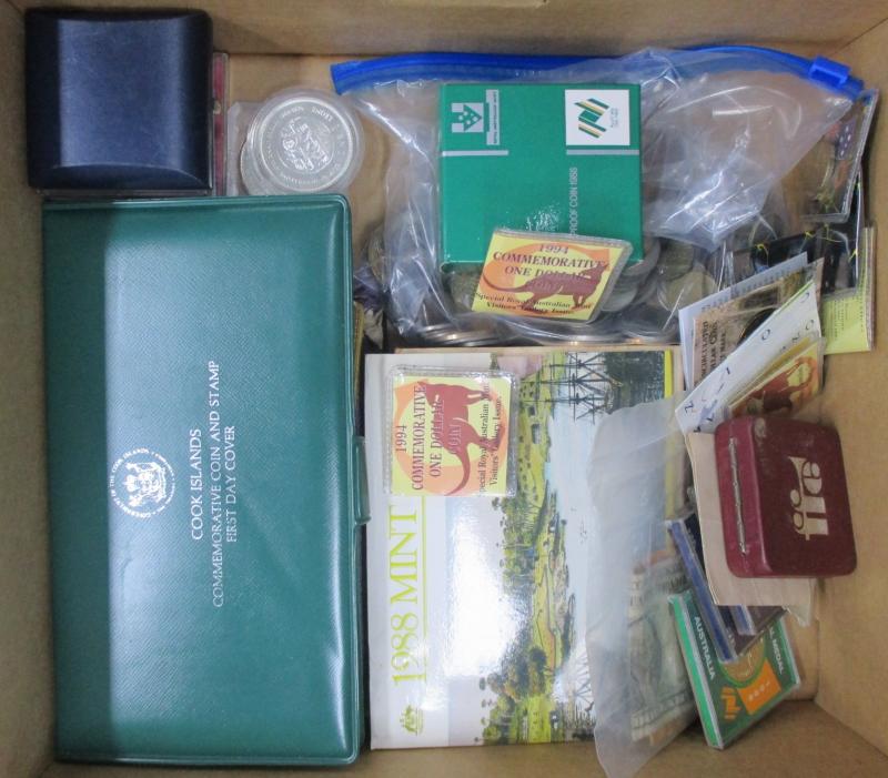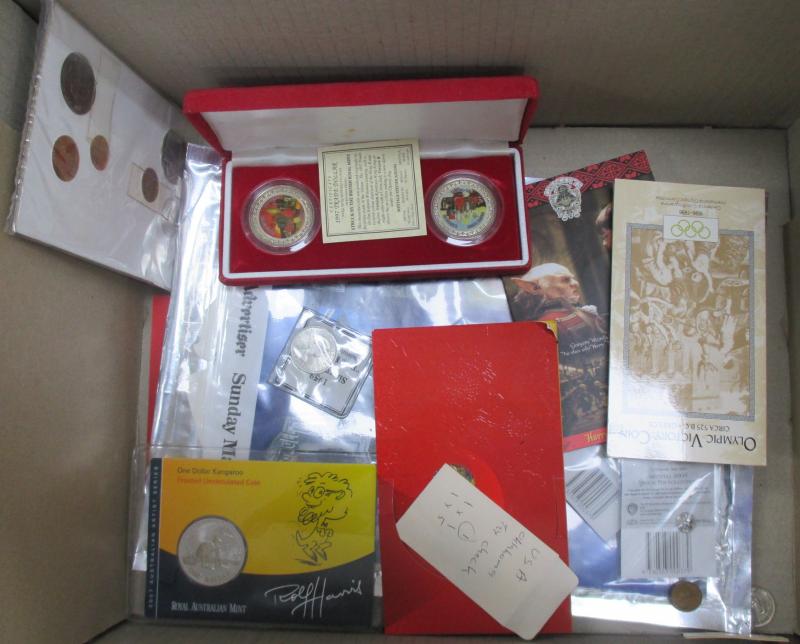 Collection remainders in box including Australia coins silver 1oz Kookaburra x2, $10 (20g 0.925) Bicentenary Proof, 1988 Unc set,