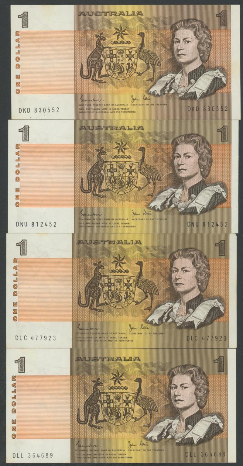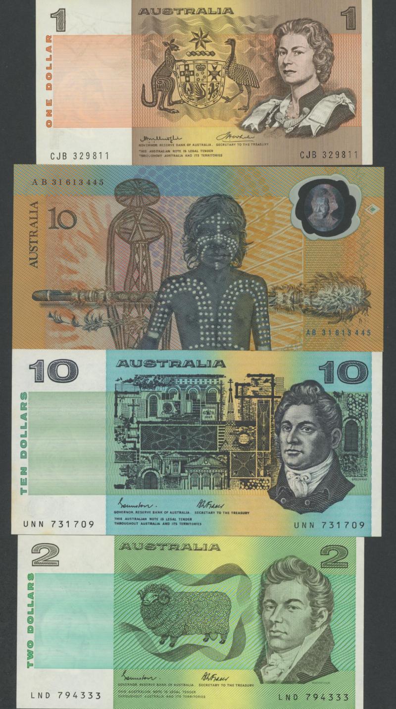 50c Cook capsules x4 $1 Unc packs (10) including 1994 Visitors Gallery mm 'C' x4, banknotes with $1 (12), $2 (8), $5 (3), & $10 (3); British Virgin Islands 1974 Proof set (aged packaging); Great Britain 1970 £sd Proof set; World coins in bag (1kg);