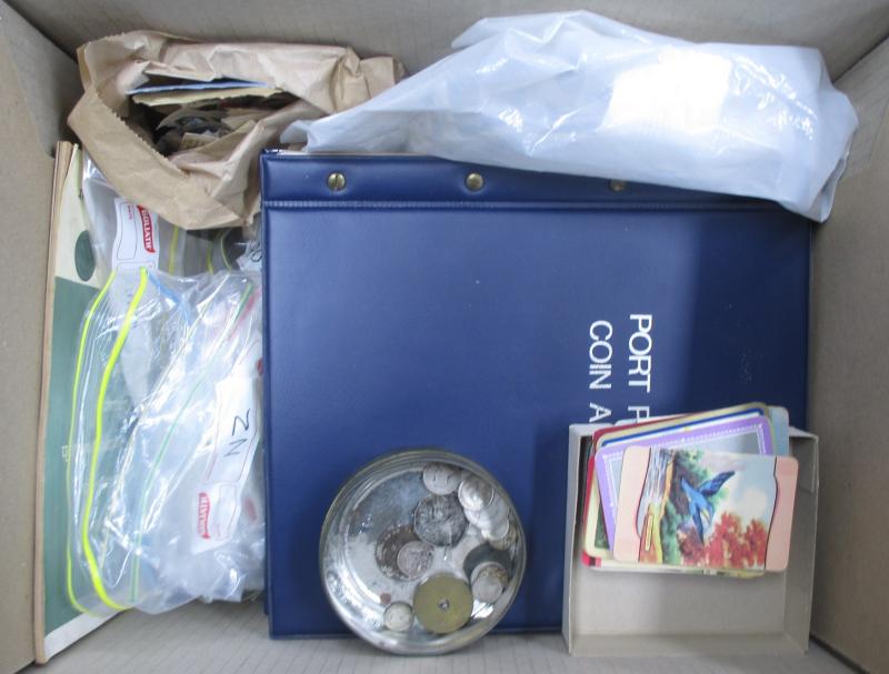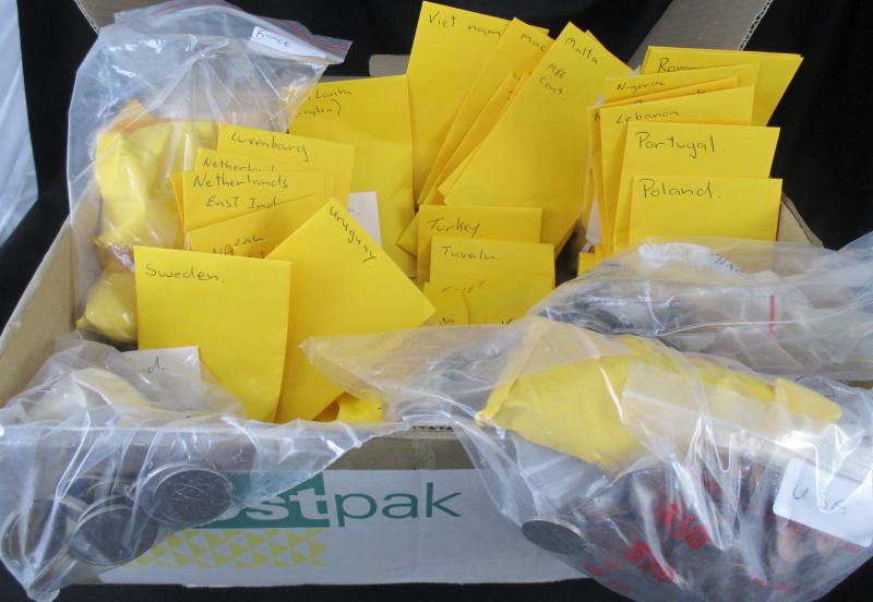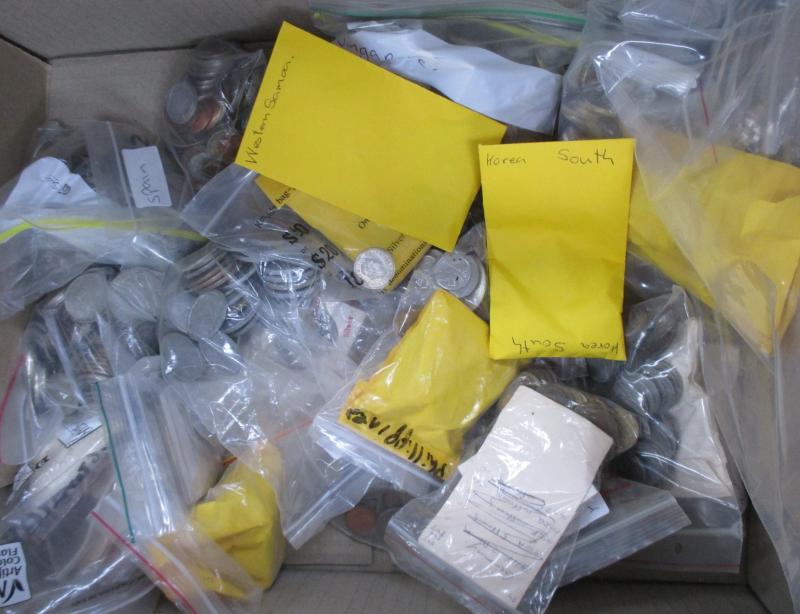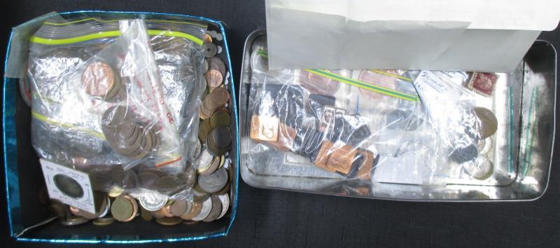 Two cartons of World coins in bags, packets, album pages, sorted by country, some casino chips, and medallions, condition variable.