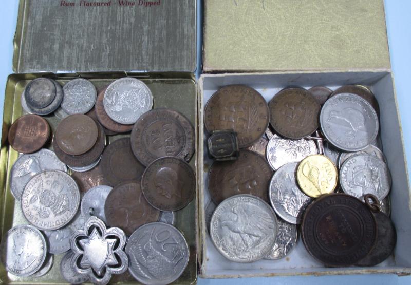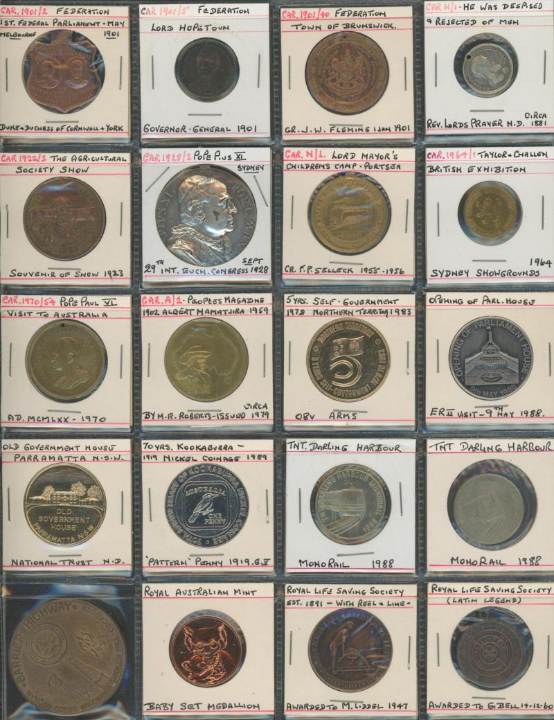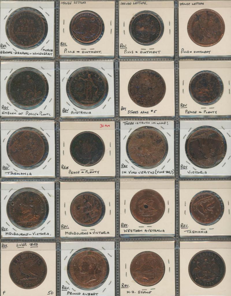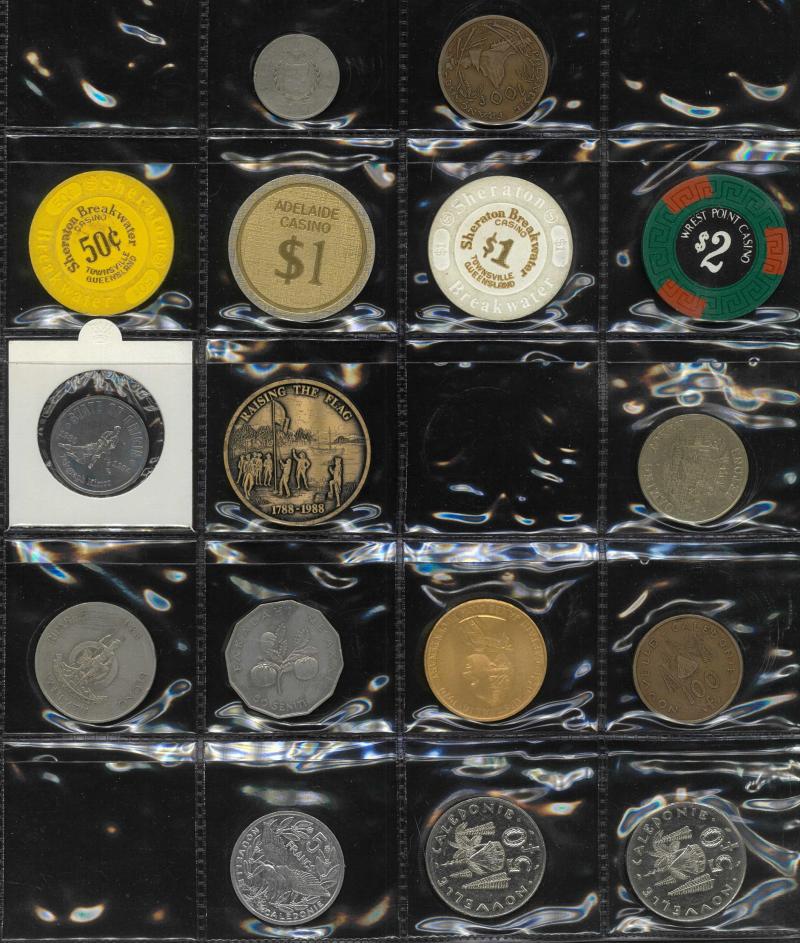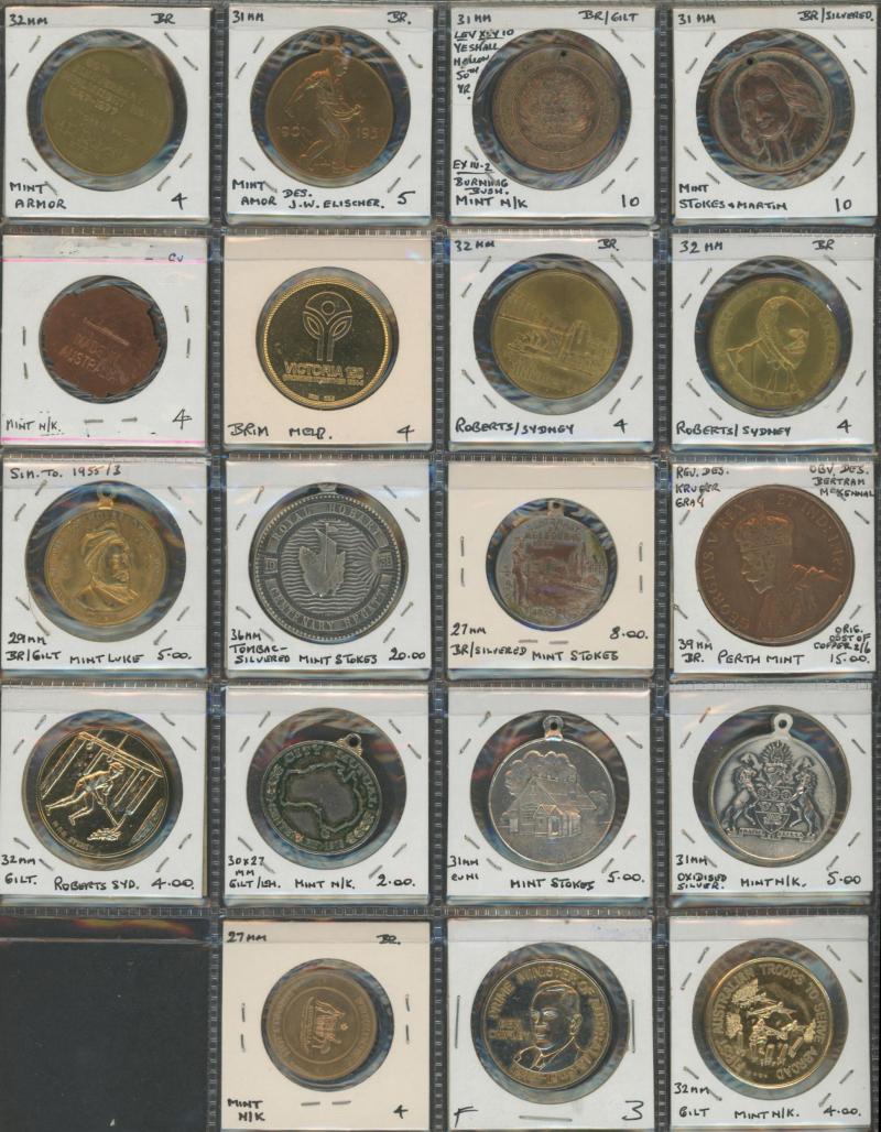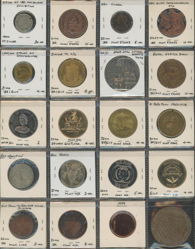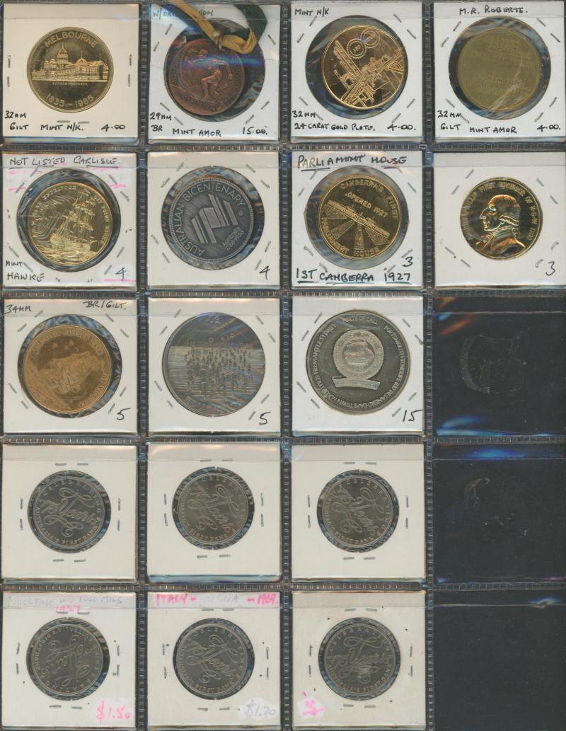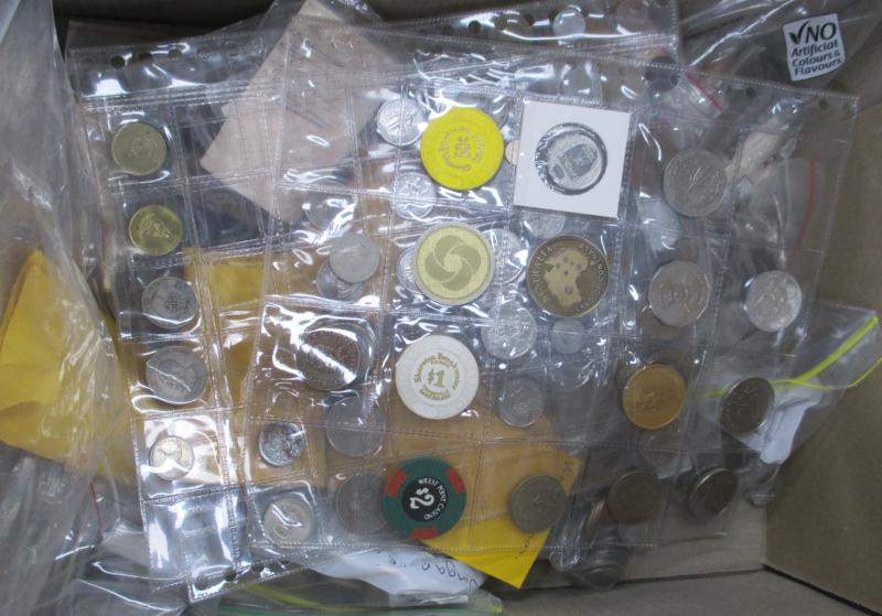 Medallions, coins, and tokens in carton, Australia with trade tokens (polished), bread tokens, gaming tokens, commemorative