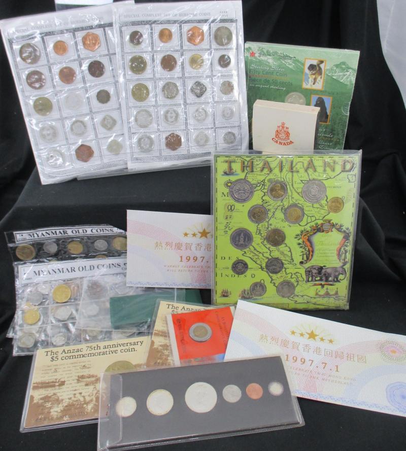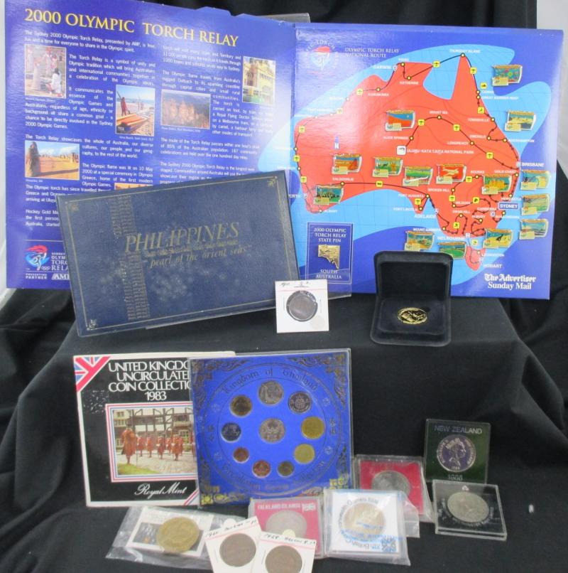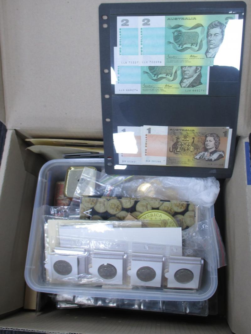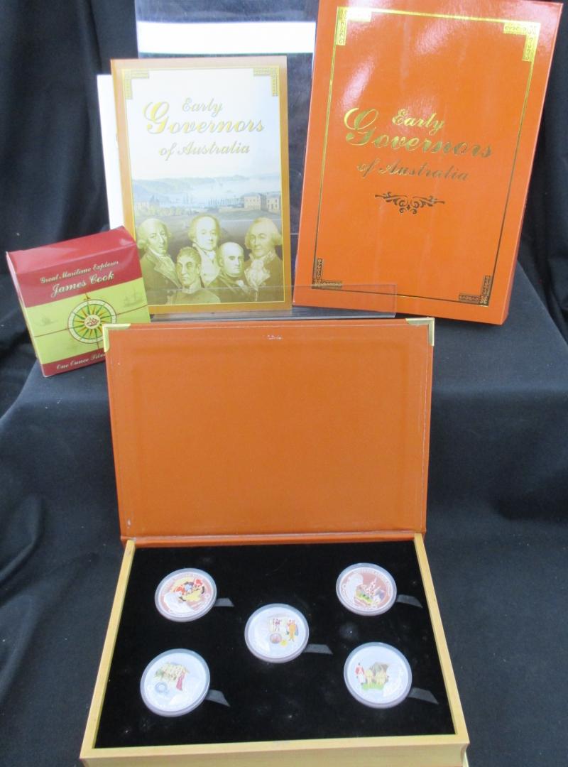Gallipoli', Tuvalu 1oz silver Captain Cook, Sydney Olympics pin badges collections; various World coin and medallion sets and singles; Canada 1967 mint set, USA 1999-2008 State Quarters with album etc; plus World banknotes mostly from 'Money of the