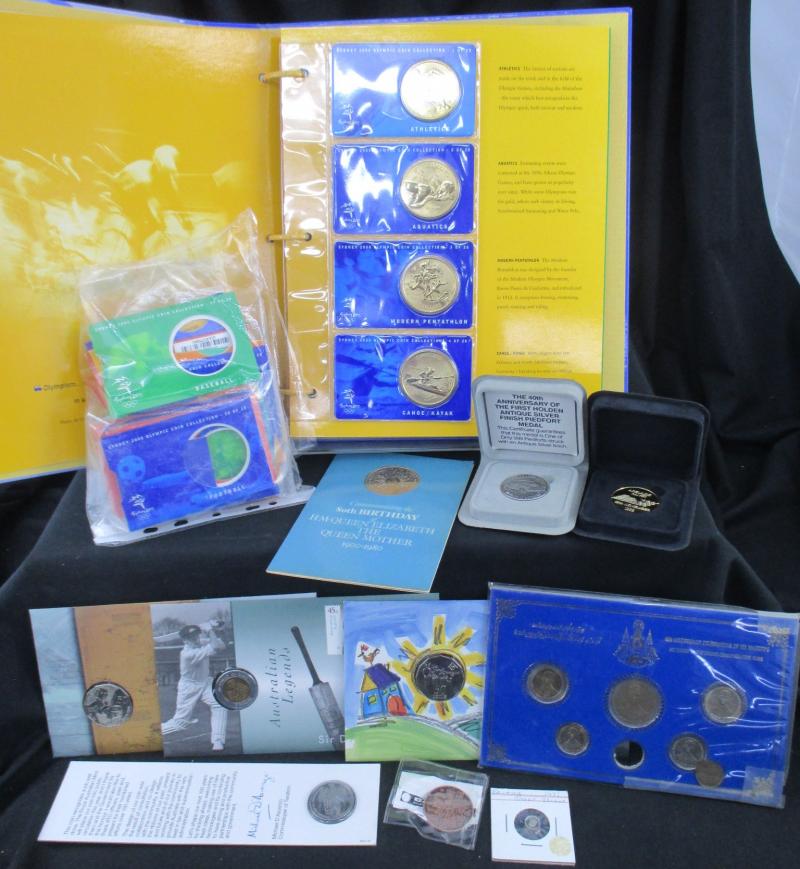 Carton containing coins with Australia 1ds & decimals including $2 coloured (25) with 2013 Coronation, 2000 Olympics $5 Al/Br set