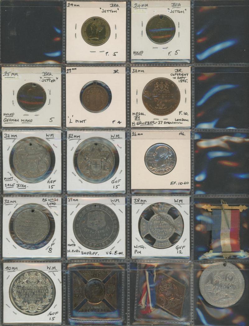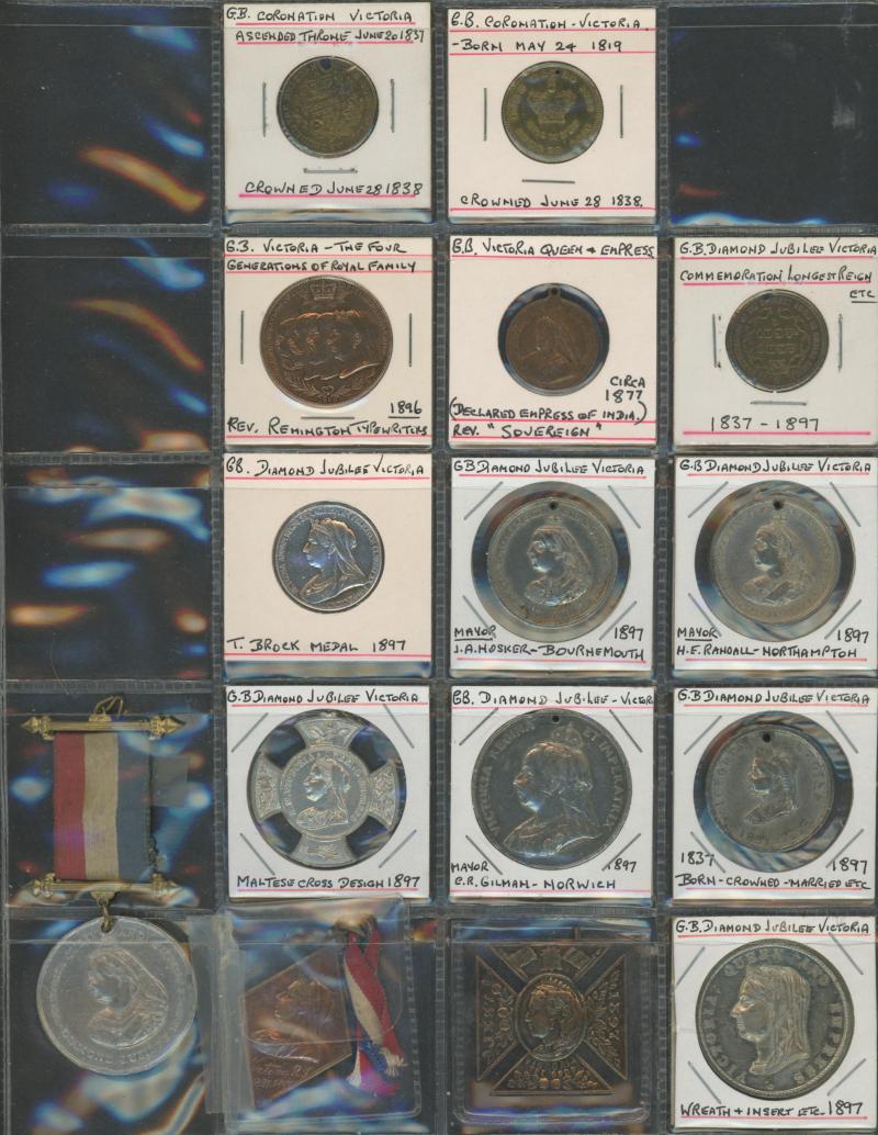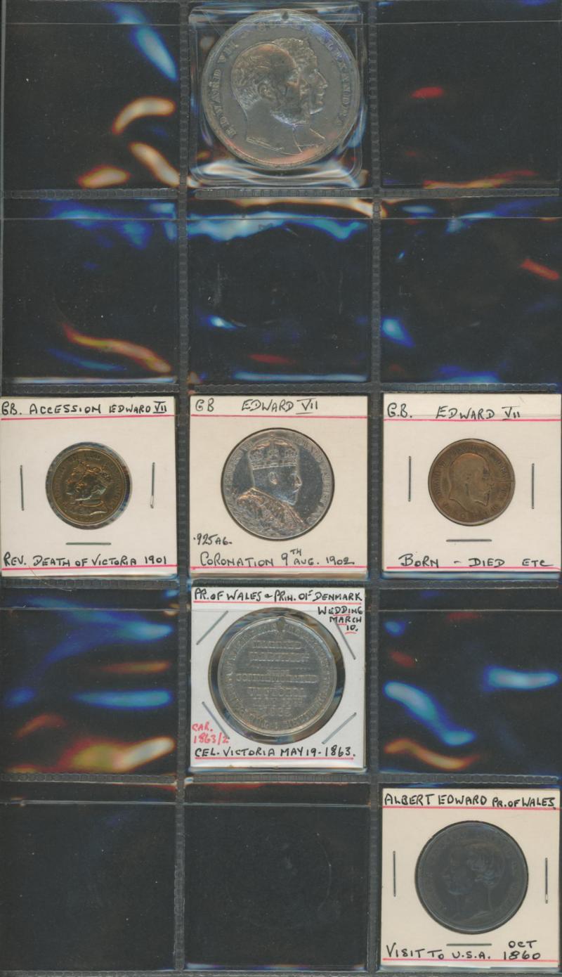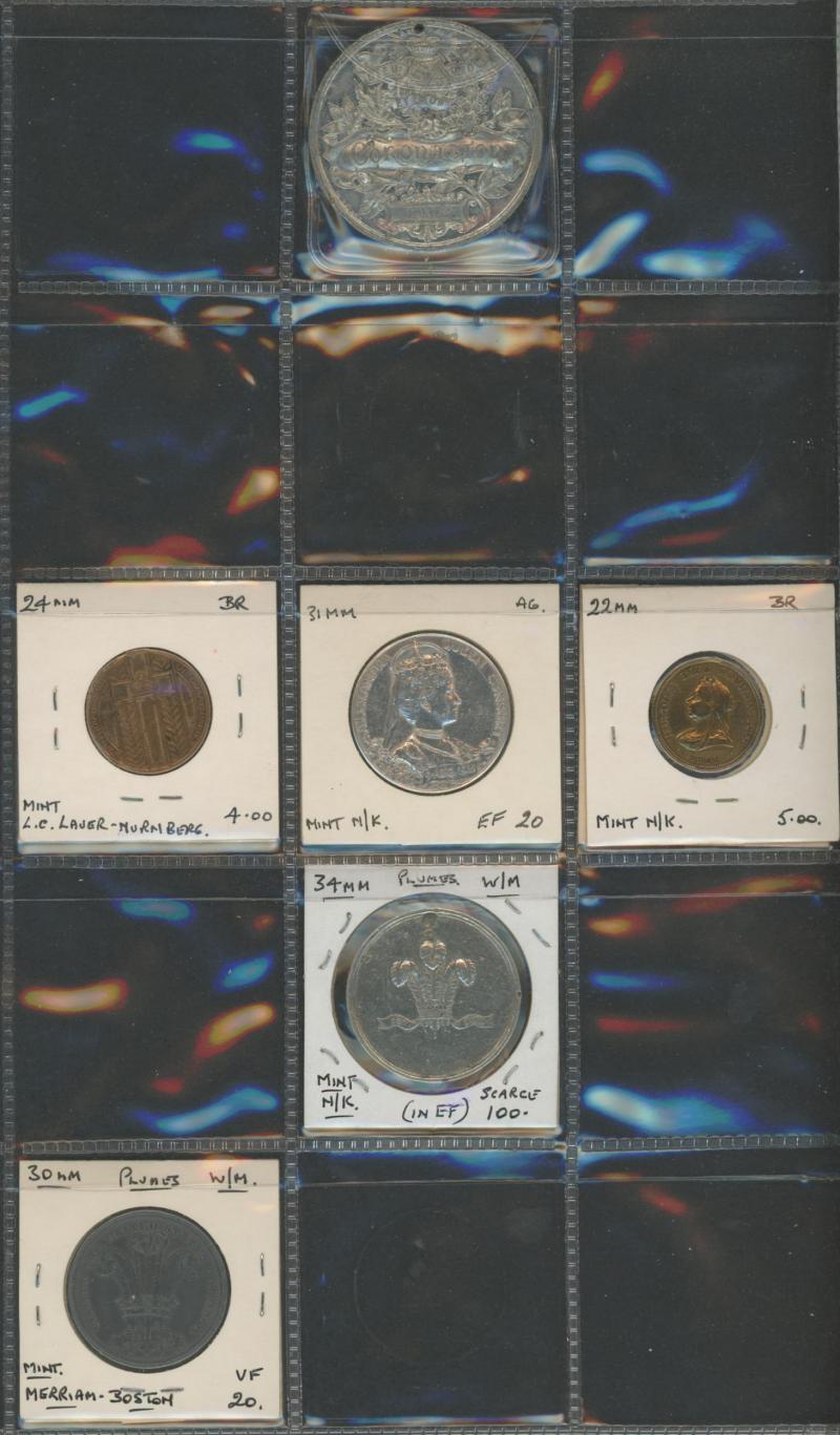 medallions including 1867 Galatea/Prince Albert; Great Britain with 1862 London Exhibition medallion, 1897 QV Diamond Jubilee medallions, vending tokens, etc, miniature coins, tin containing World coins, tin of military insignia, WWI & WWII medals
