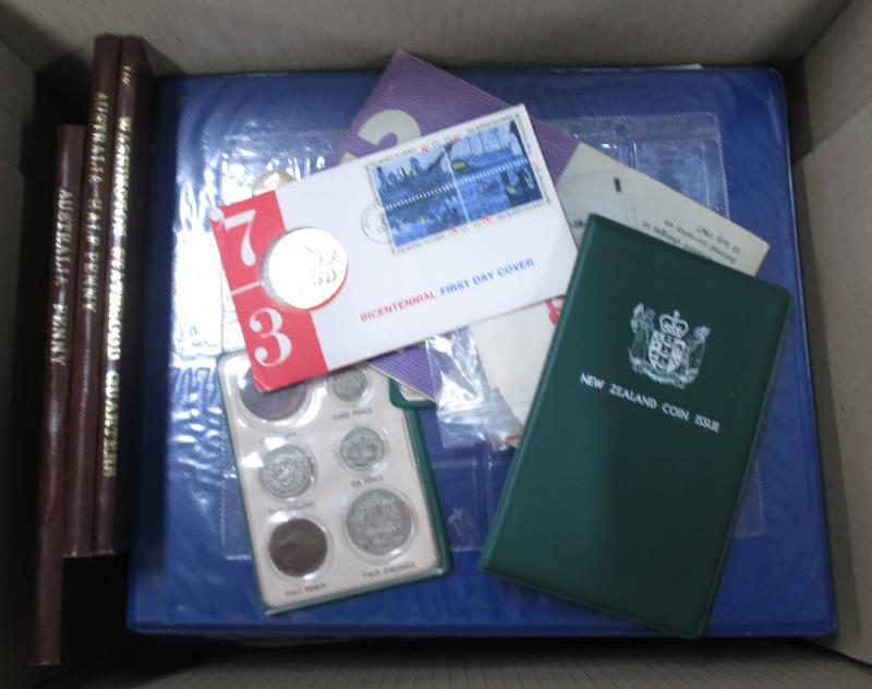 Carton containing remainders with Australia ½d & 1ds in tin, album with 3d, 6d, a few Florins, and 50c 1966 round x5, and some
