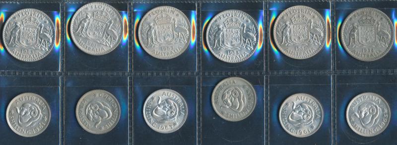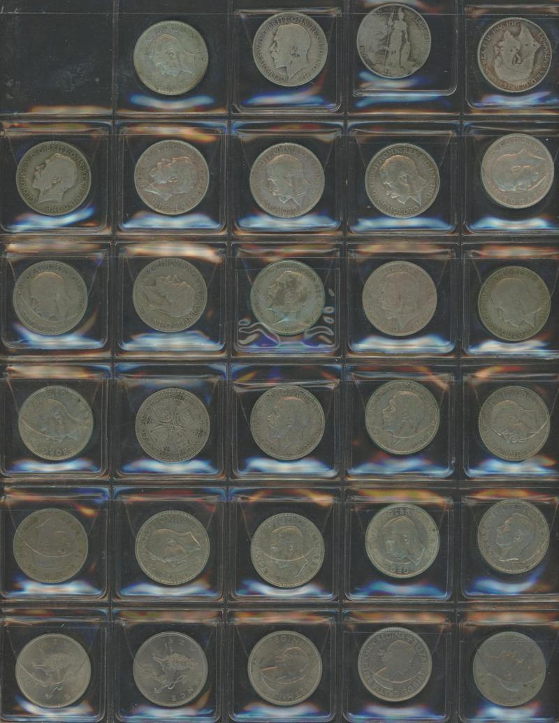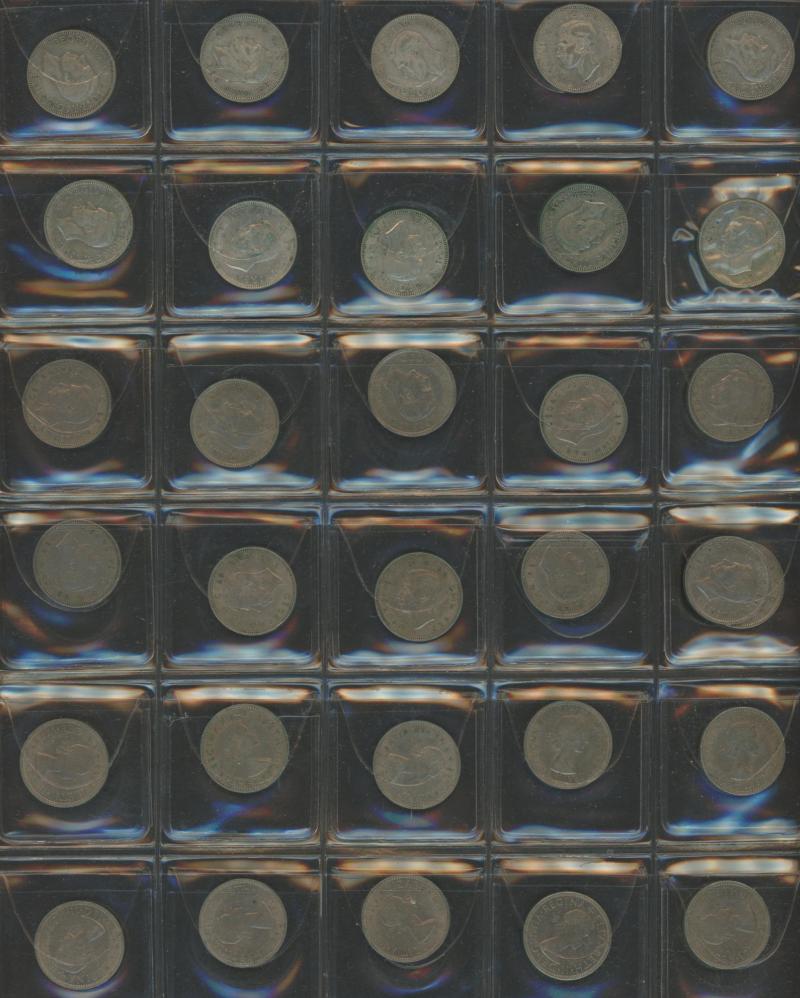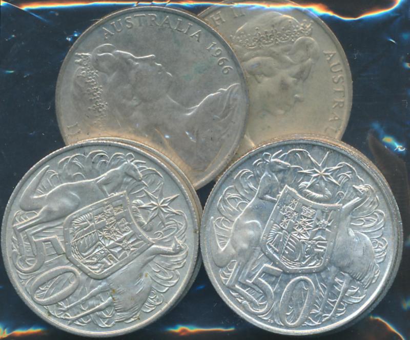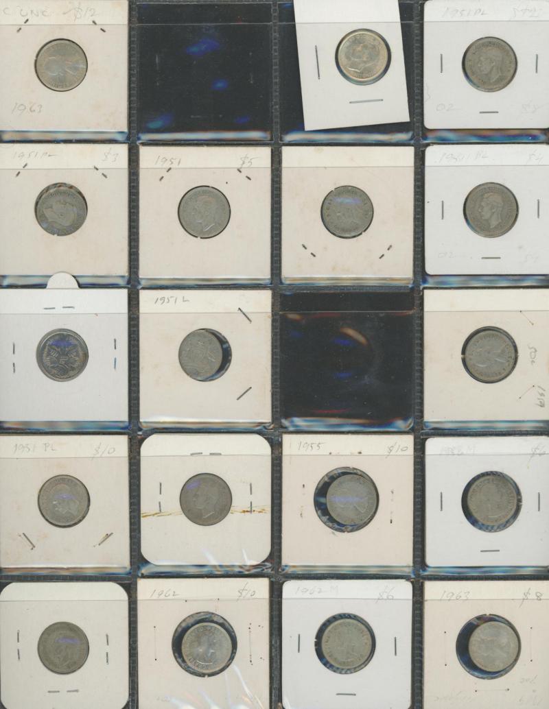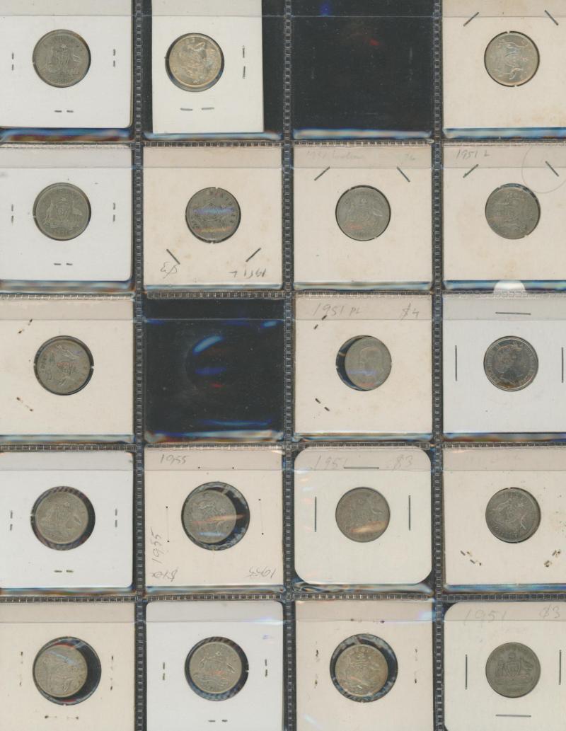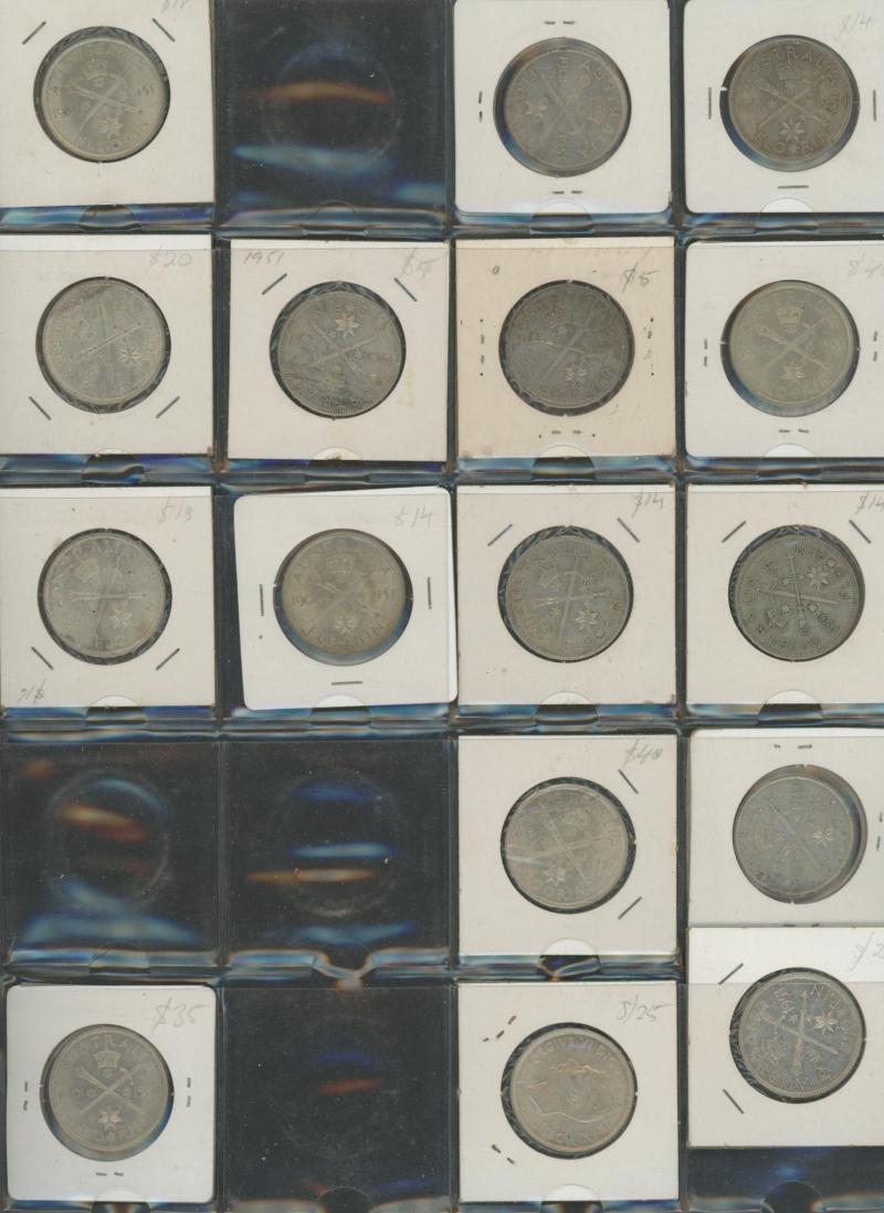 Box of consignment remainders with Australia 1937 Crown, post-1946 1/- x6, 2/- x6, 1966 round 50c x7, Royal Agricultural Society