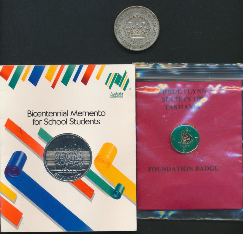 Tasmania 1970s-80s member fobs; some Australia and GB ½ds & 1ds, plus George III & QV Crown (poor), and Malaya KGVI 1941 $1 banknote; also military skeleton face watch; condition variable. (Image1) (Image2)