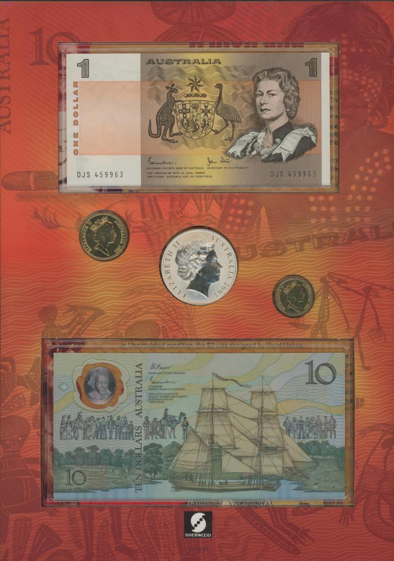 album, banknotes with $1 & $2 x3, $20 Maritime Heritage folder, and Sherwood 'Indigenous Australia' folder with $1, & $10 Bicentenary notes, $1 $2 & $1 silver 1oz coins; World coins in albums including Great Britain Farthing dates, and bag of fake