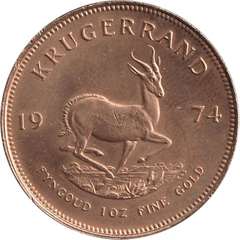 KRUGERRRAND: 1974 gold (33.93g, 0.917) KM73, obv. Paul Kruger, rev. Springbok, total agw 1oz troy, a few contacts, aUnc. (Image1) (Image2)