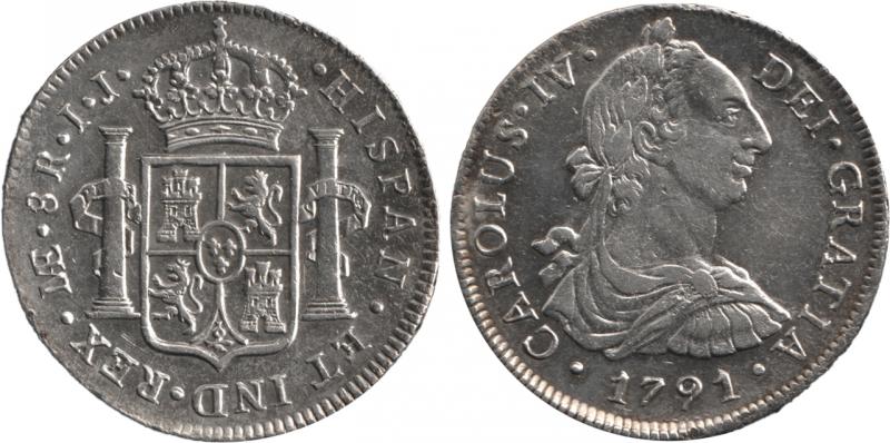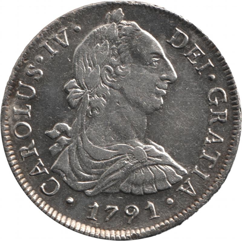 Spanish Colonial Eight Reales 1791 Charles IV silver (27.04g) KM 87, mintmark 'LIMAE I.J.', cleaned otherwise VF. (Image1) (Image2)