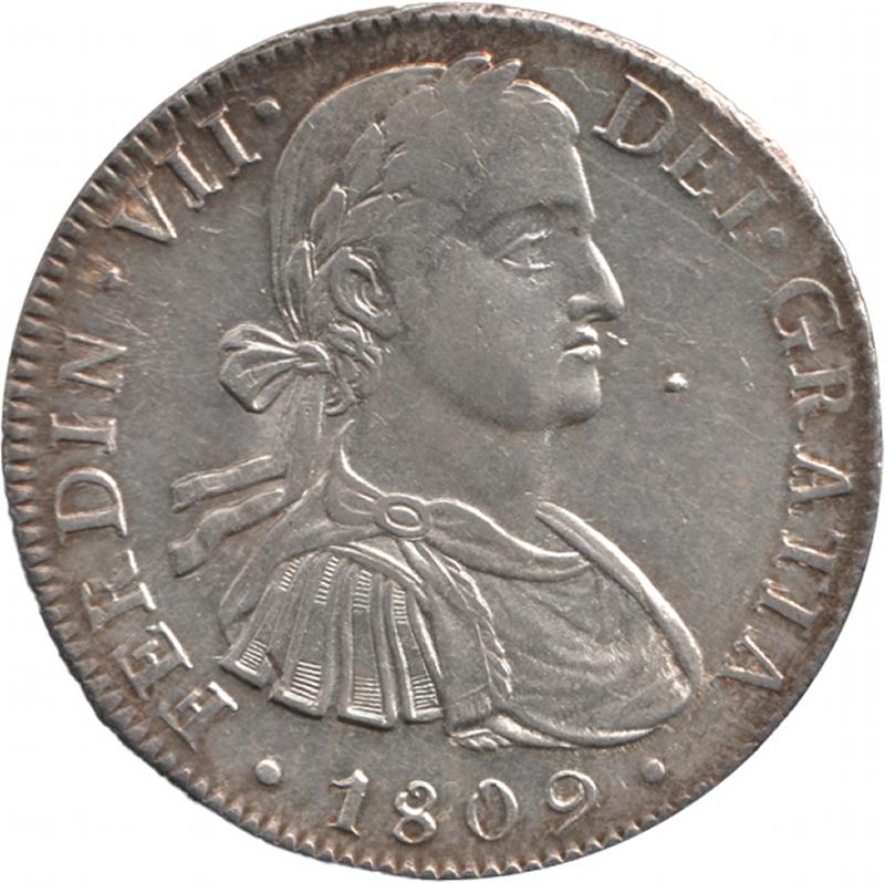 Spanish Colonial Eight Reales 1809 Ferdinand VII silver (27.00g) KM 110, mintmark 'Mo T.H.' Mexico City Mint, obv. cleaned, rev.