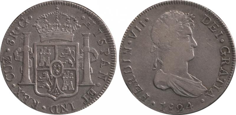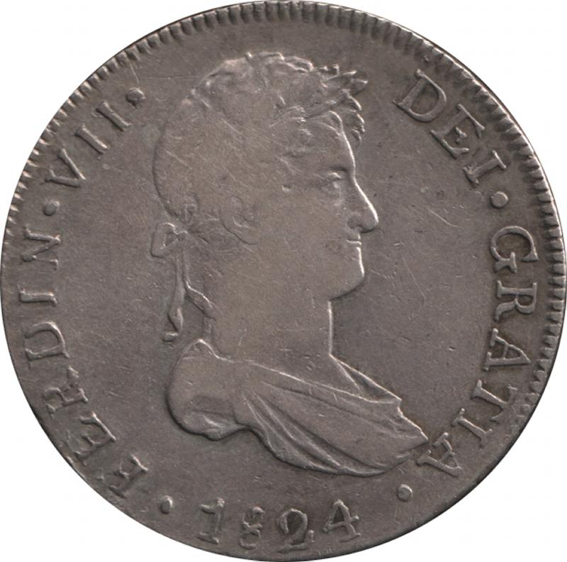 Spanish Colonial Eight Reales 1824 Ferdinand VII silver (27.25g) KM 117.2, mintmark 'CUZCO .G.', gFine. (Image1) (Image2)