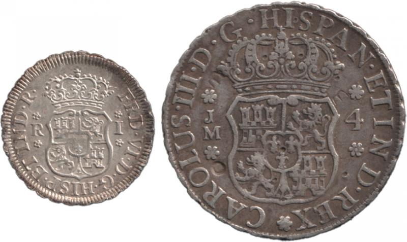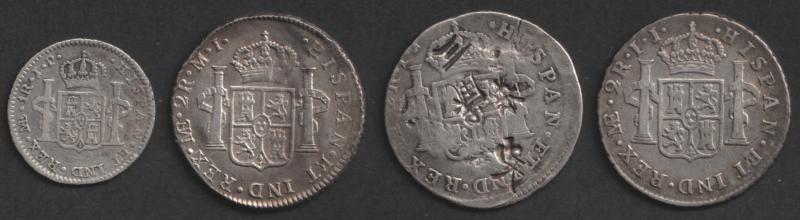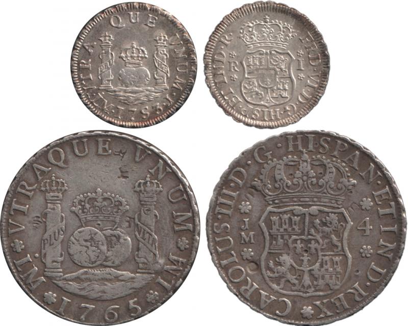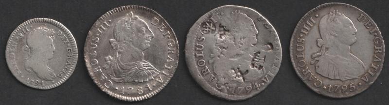 1781MI Charles III KM 76, 1794IJ (multiple chops) and 1795IJ Charles IV KM95; and 4 reales 1765PR Charles III KM 63 (aVF); condition variable.