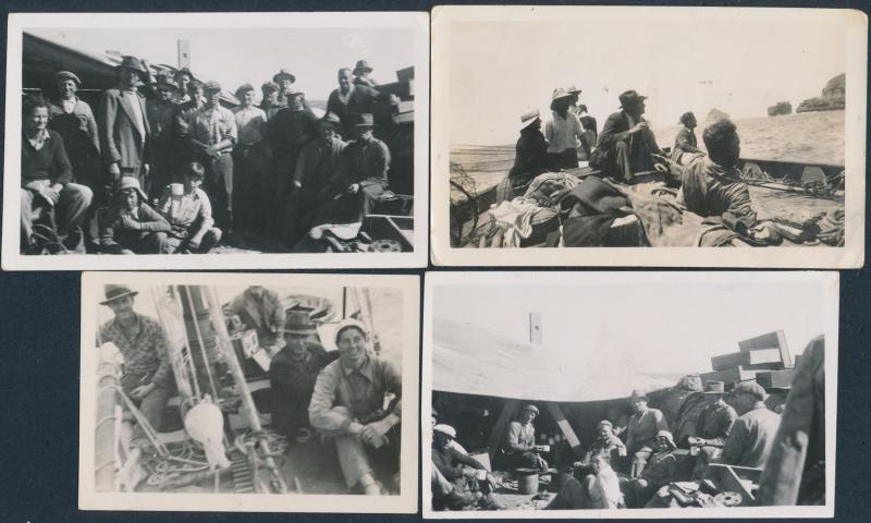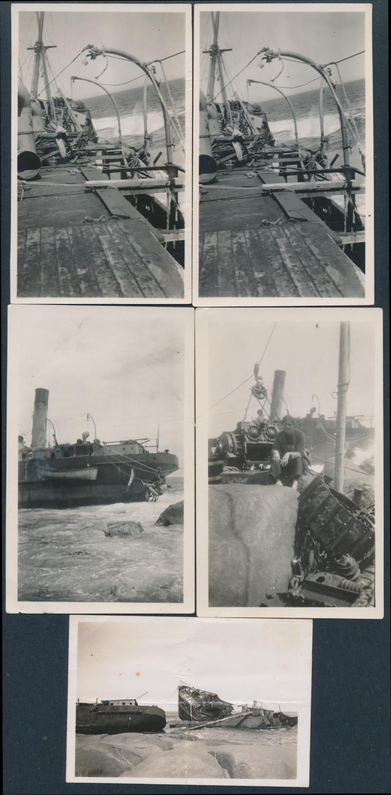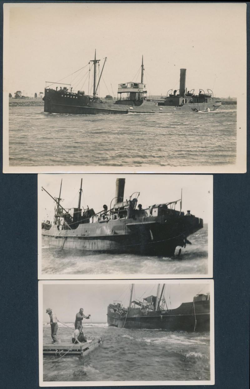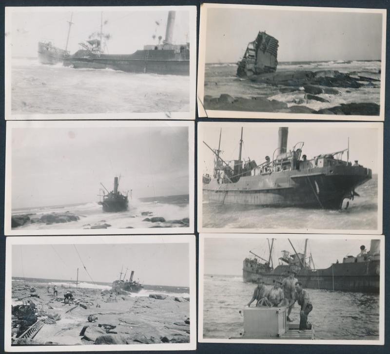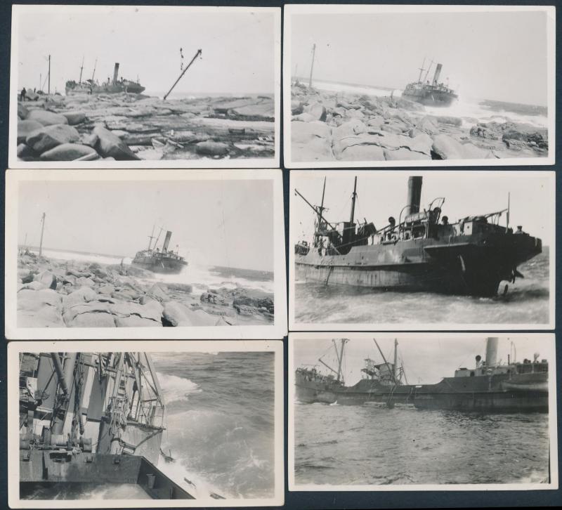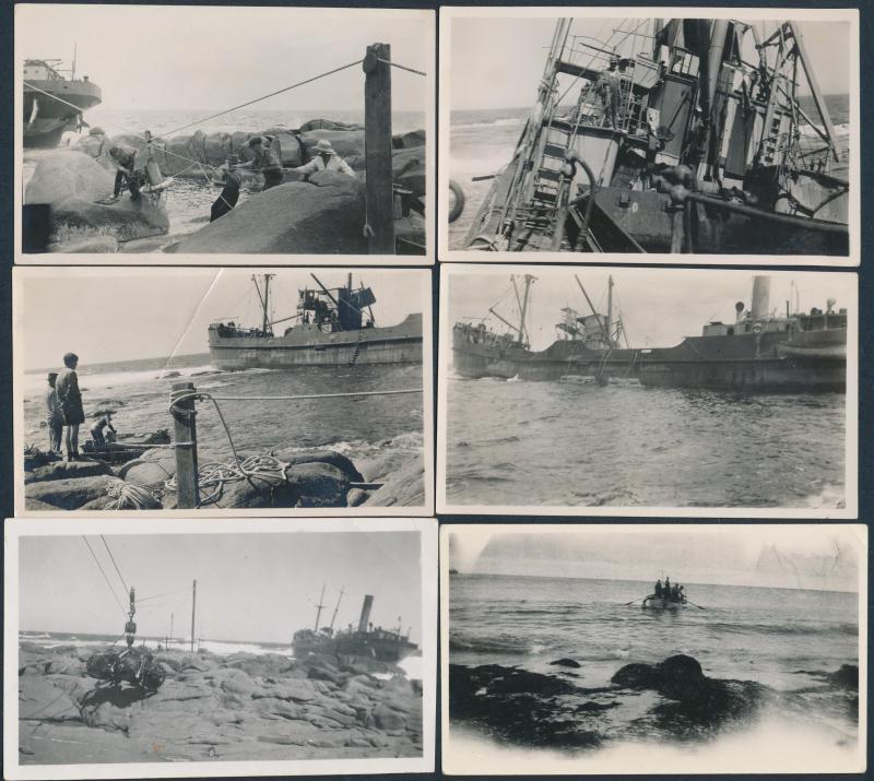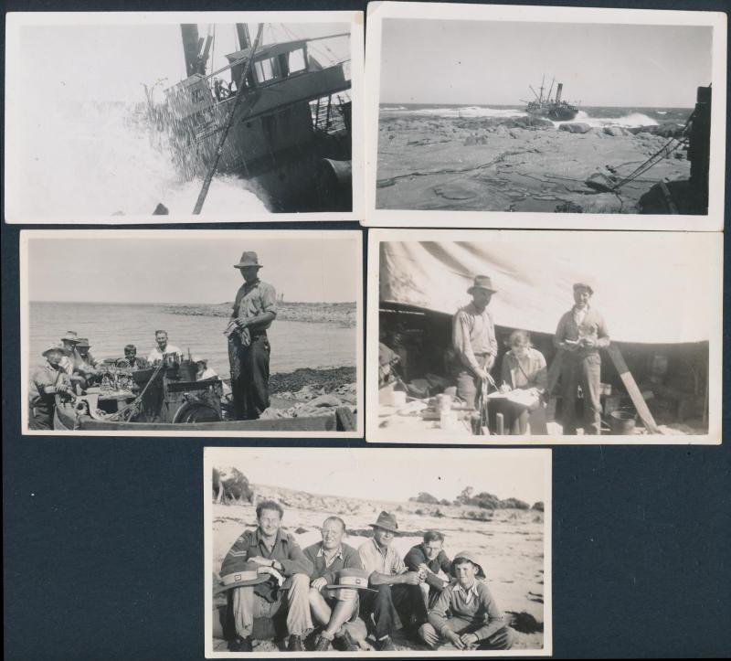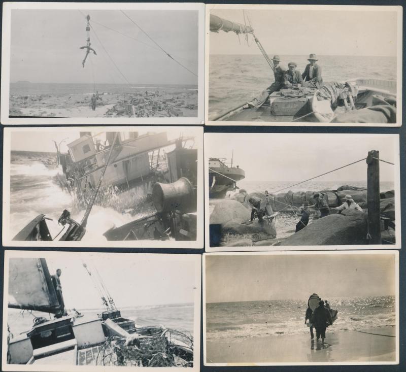 Island (South Australia), several of the vessel breaking-up (the largest of 250x195mm has a few faults), ropes rigged between the ship & shore bringing over the engine & anchor etc, others of the crew & passengers, etc, also 1930s (?) shot of the