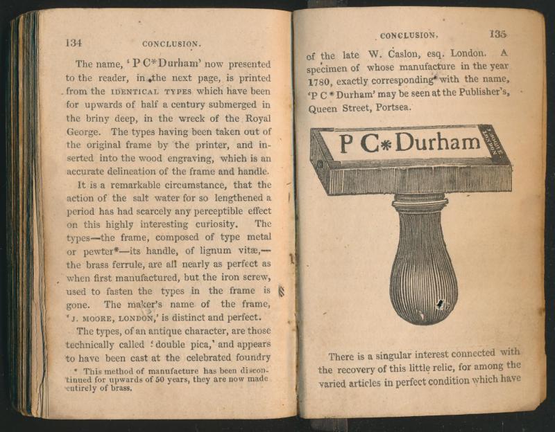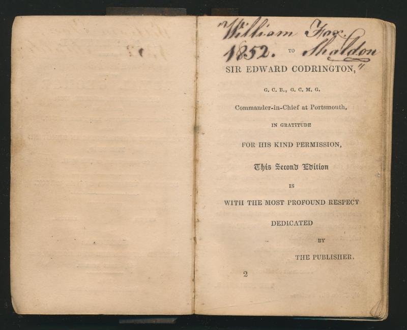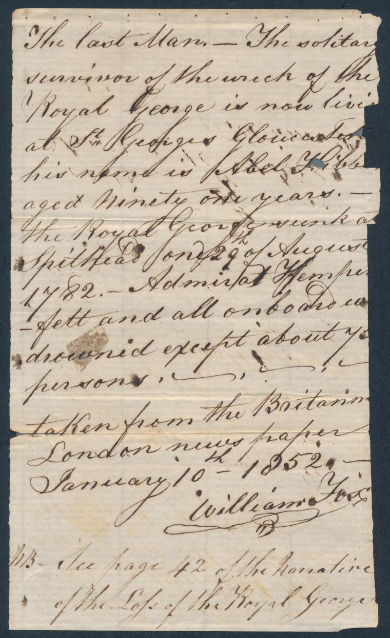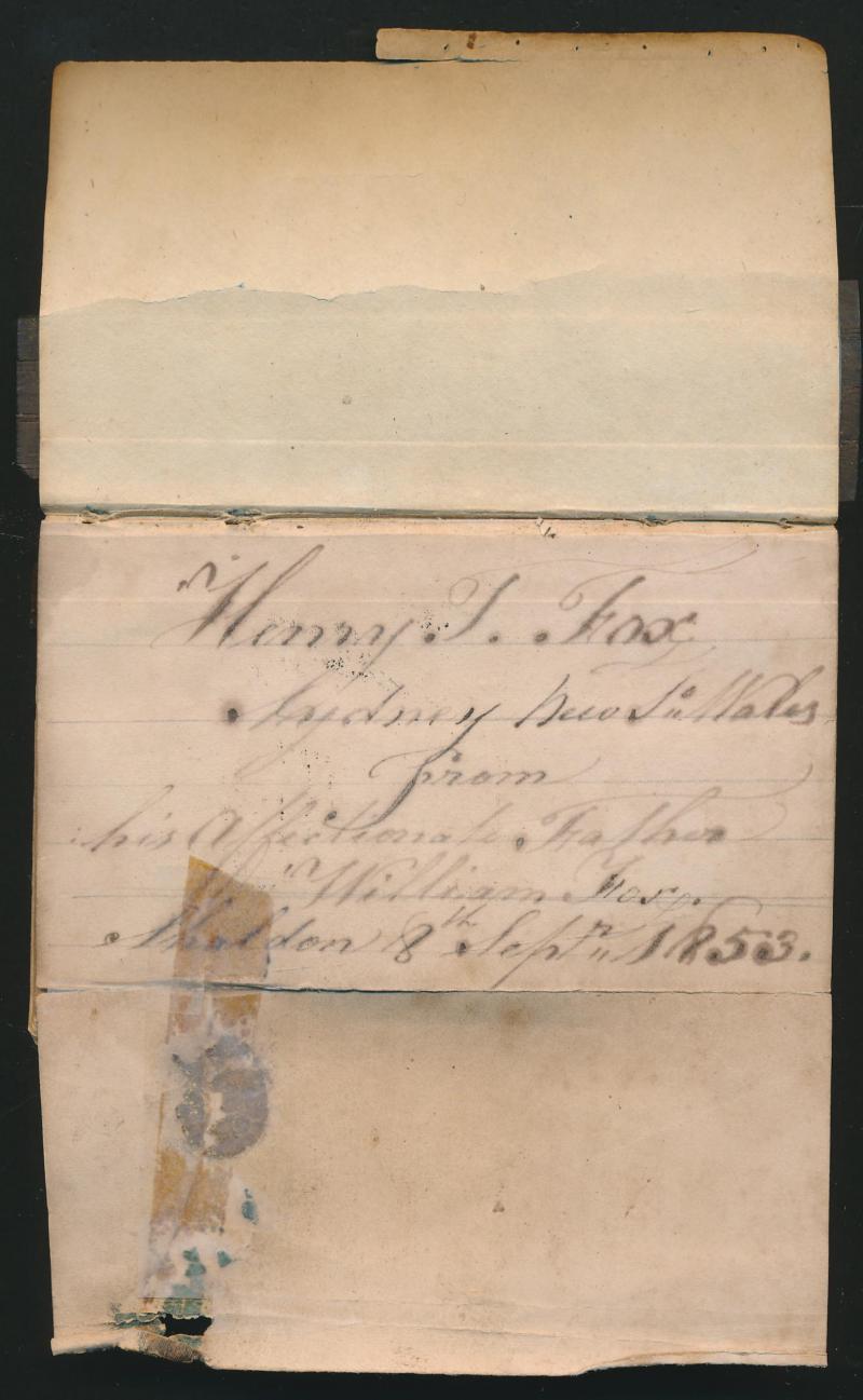 (repaired) inscribed 'Henry J Fox/Sydney New South Wales/From/His affectionate Father/William Fox/Maldon 8th Sept 1853', plus additional letter "The last Man - The solitary survivor of the wreck of the Royal George is now living at St. Georges