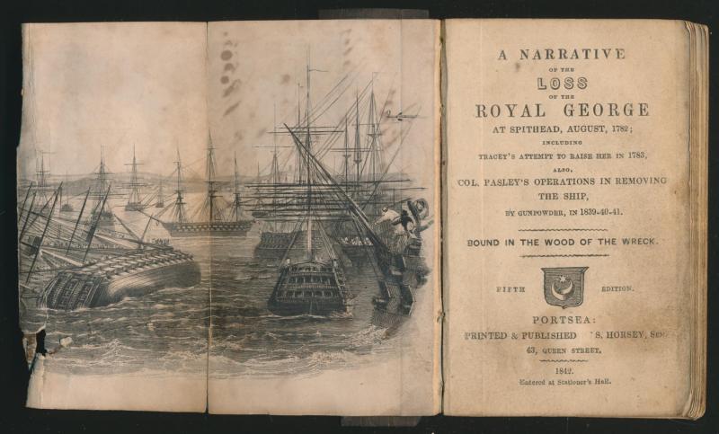 Pasley's Operations in removing the Wreck by Explosions of Gunpowder in 1839-40-41' published by S. Horsey Sen, 1842 Fifth Edition, 136pp harbound in wood from the wreck (50% missing from front board, back board cover separated), inner fold out plate