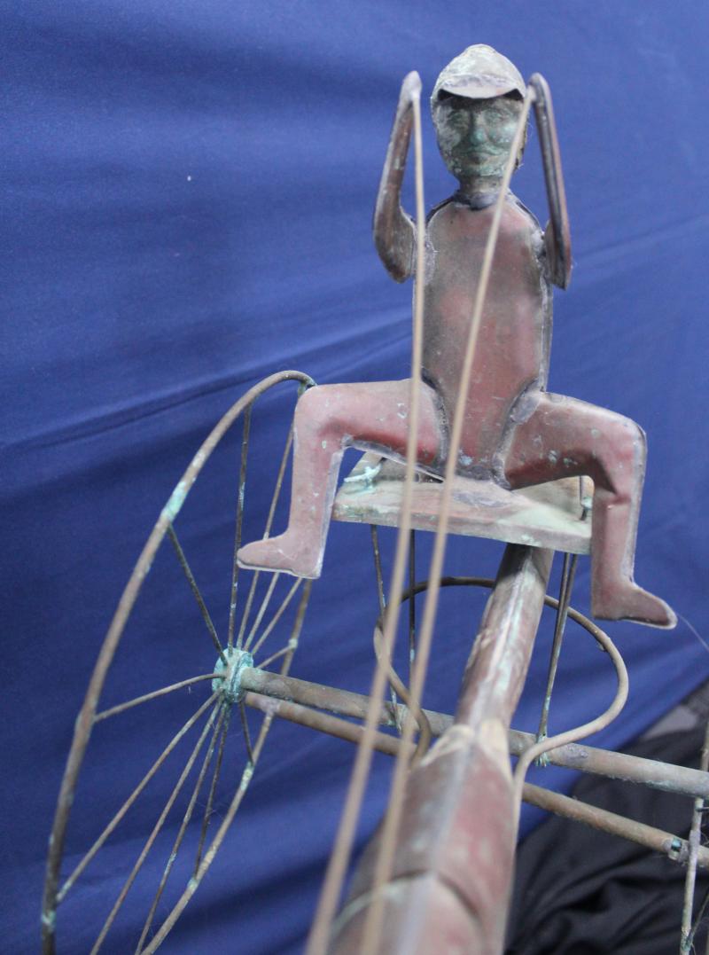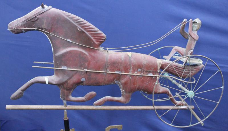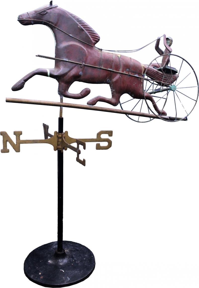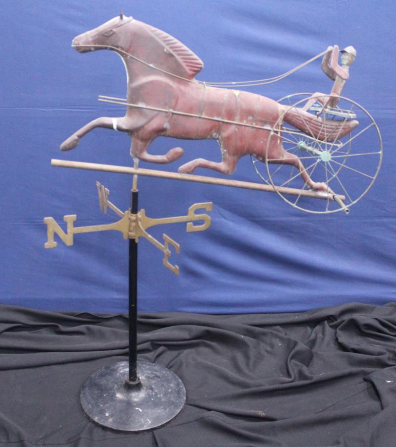 Trotter Weather Vane with sulky, horse and jockey, metal, with stand, 80cm long & 118cm tall, mainly Fair/Fine. (Image1) (Image2)