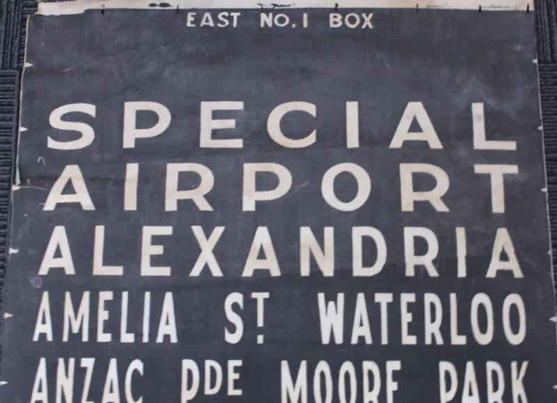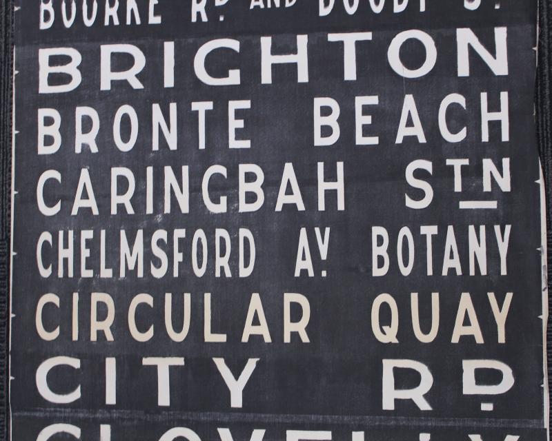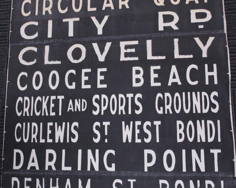 Tram destination roll Sydney circa 1960s alphabetical listing including Airport, Bondi Beach, Circular Quay, Cricket and Sports