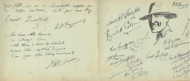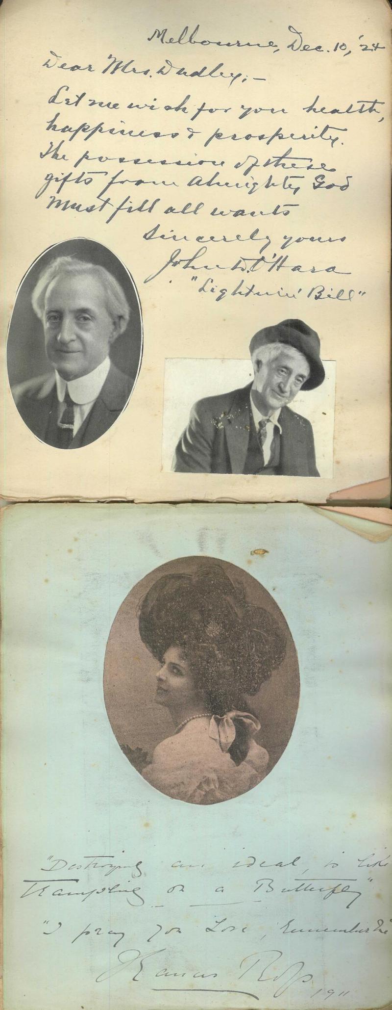 including cricketer JB Hobbs, 'Snowy' Howell WW1 VC winner, Vivien Leigh, Laurence Olivier, Harry Lauder; aviators Keith Smith, Ross Smith, Wally Shiers, C Scott, Jimmy Melrose & TC Black; 1947 Indian cricket team; two books of theatre personalities