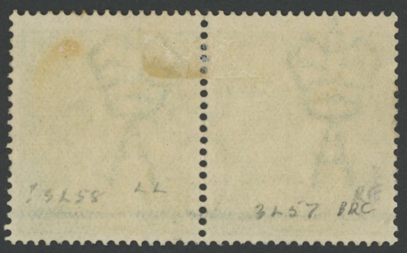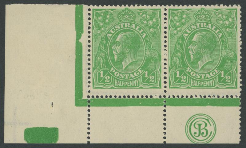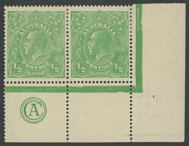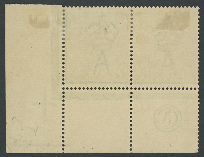 ½d green SG 20 Electro 2 'CA' Monogram lower left corner pair ACSC 63(2)zb, well-centred, hinge remainders & perf reinforcing, Cat