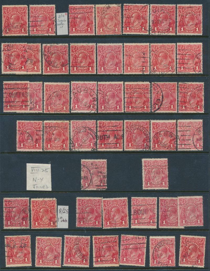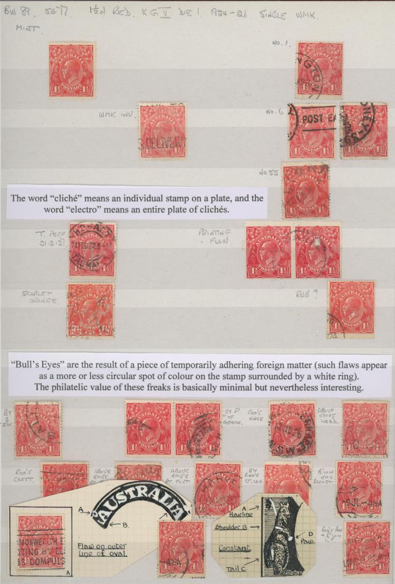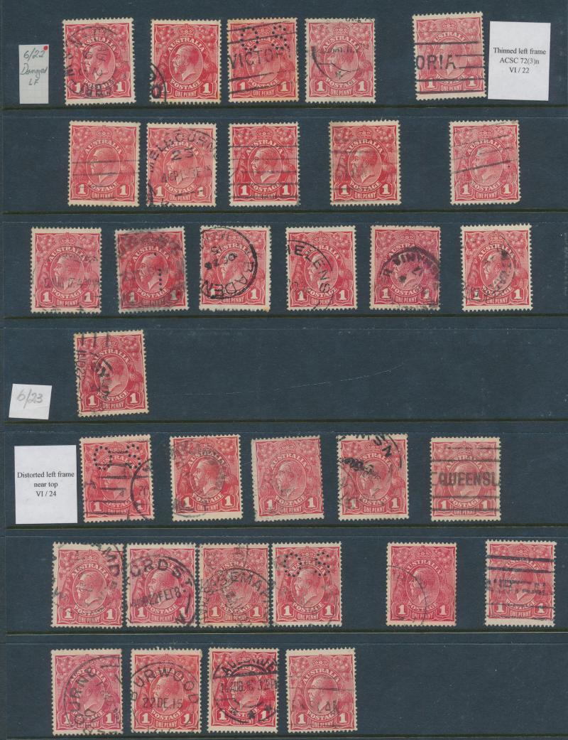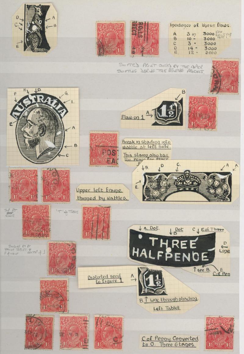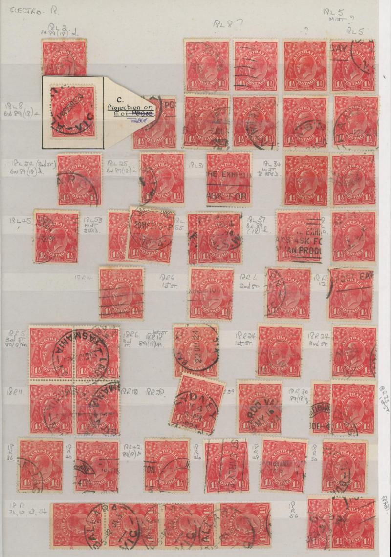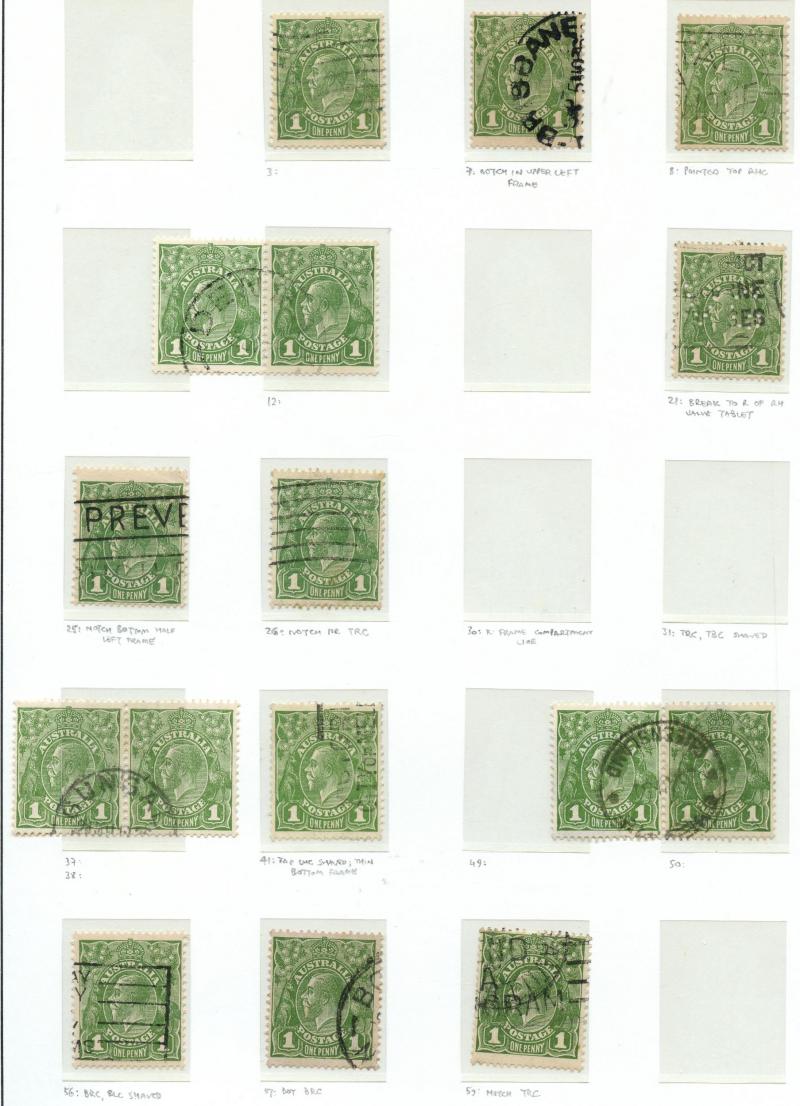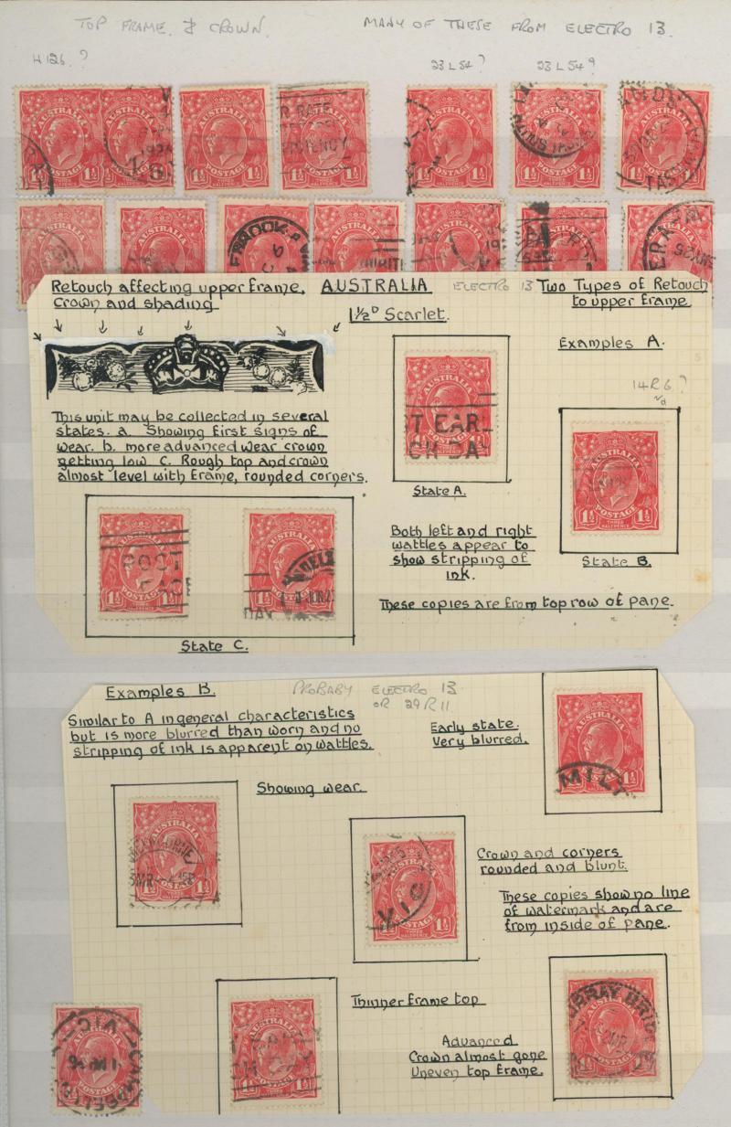 replaced it, No Wmk Obliterated 'AL' of 'HALFPENNY', etc, also a detailed study of Electro 13 & 14 Worn Upper Frames, also lots of other multiples, Federal & State Government punctures, and unplated examples many with dated cancels & potential
