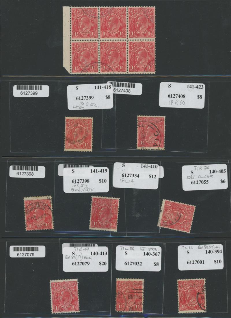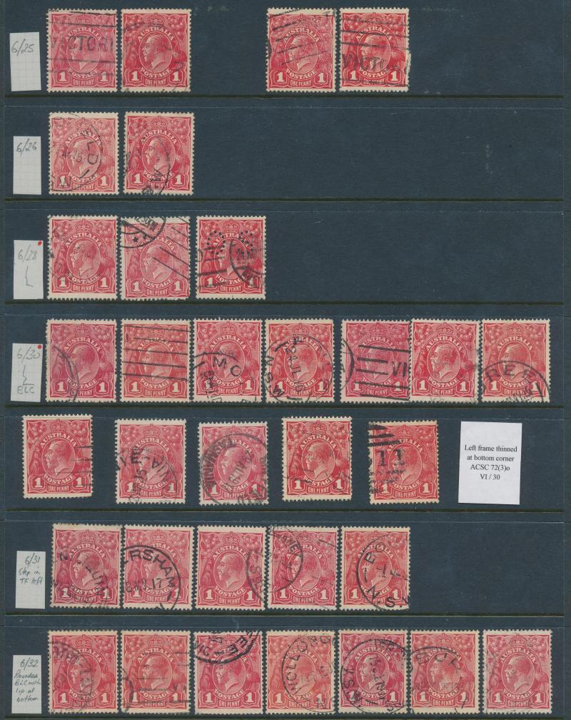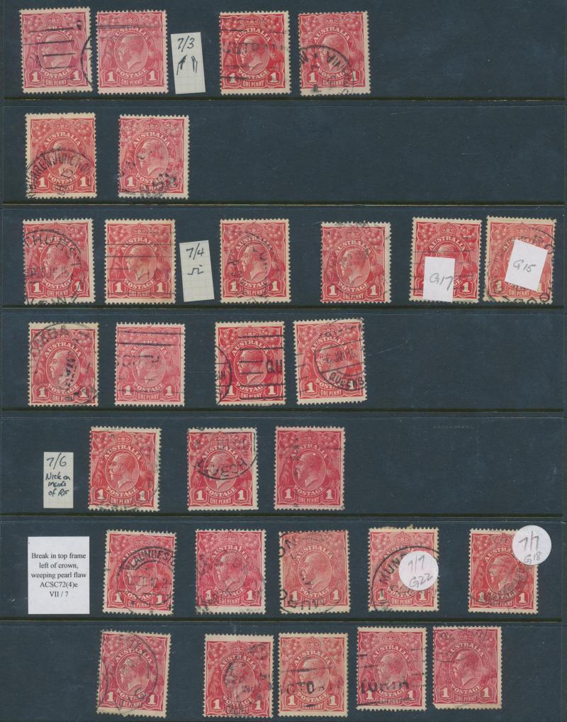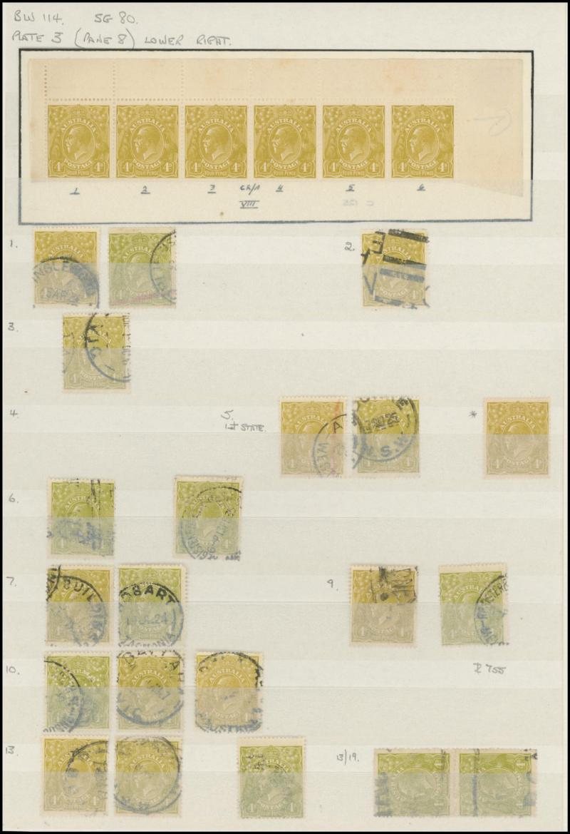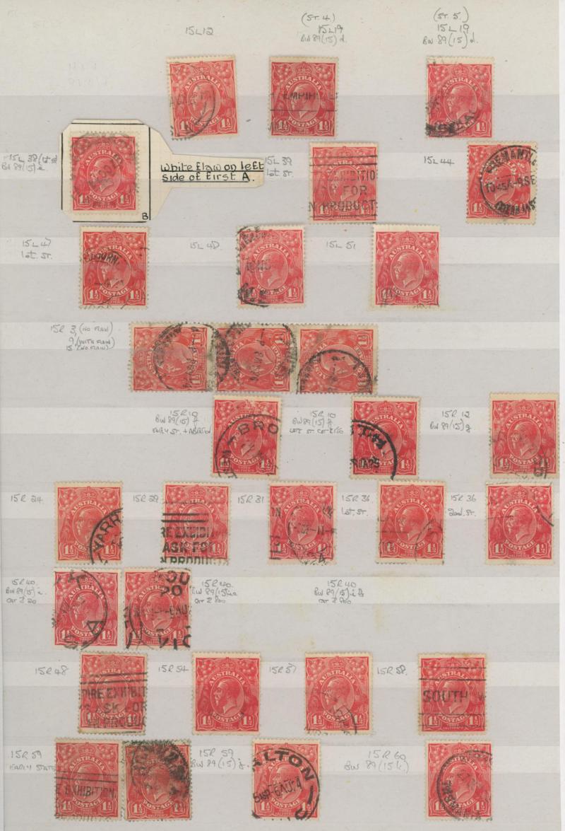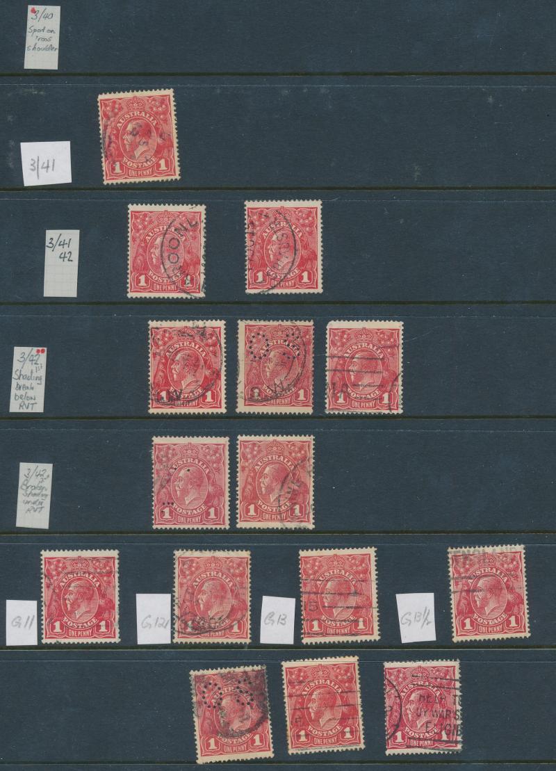 replaced it, No Wmk Obliterated 'AL' of 'HALFPENNY', etc, also a detailed study of Electro 13 & 14 Worn Upper Frames, also lots of other multiples, Federal & State Government punctures, and unplated examples many with dated cancels & potential